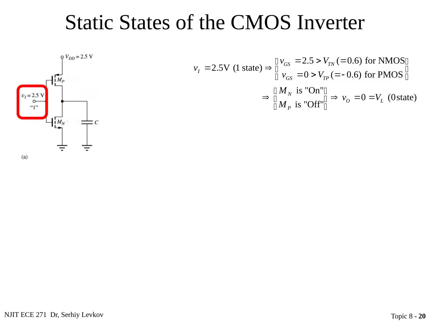 20 .NJIT ECE 271 Dr, Serhiy Levkov Topic 8 - 20 Static States of the CMOS Inverter The capacitor discharges through R onN , current exists only during discharge, no dc current exists.