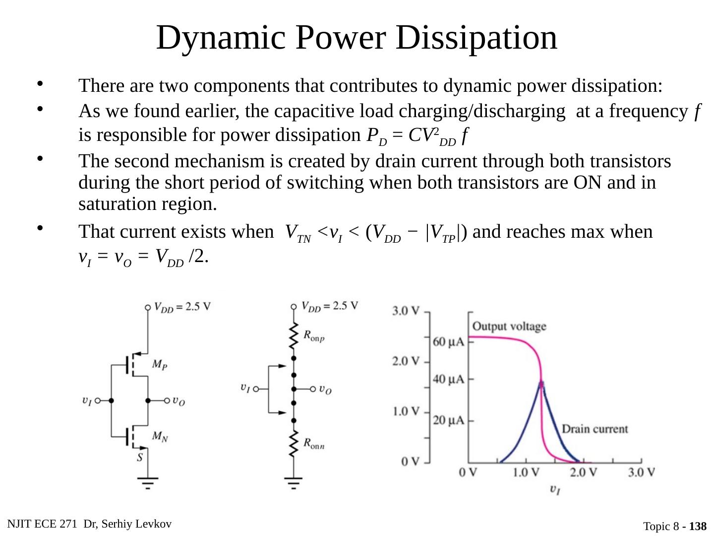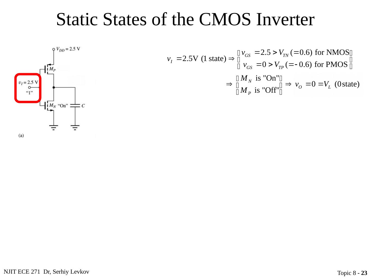 22 .NJIT ECE 271 Dr, Serhiy Levkov Topic 8 - 22 Static States of the CMOS Inverter The capacitor discharges through R onN , current exists only during discharge, no dc current exists.
