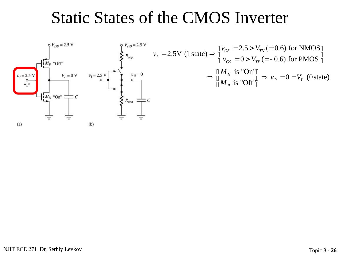 25 .NJIT ECE 271 Dr, Serhiy Levkov Topic 8 - 25 Static States of the CMOS Inverter The capacitor discharges through R onN , current exists only during discharge, no dc current exists.