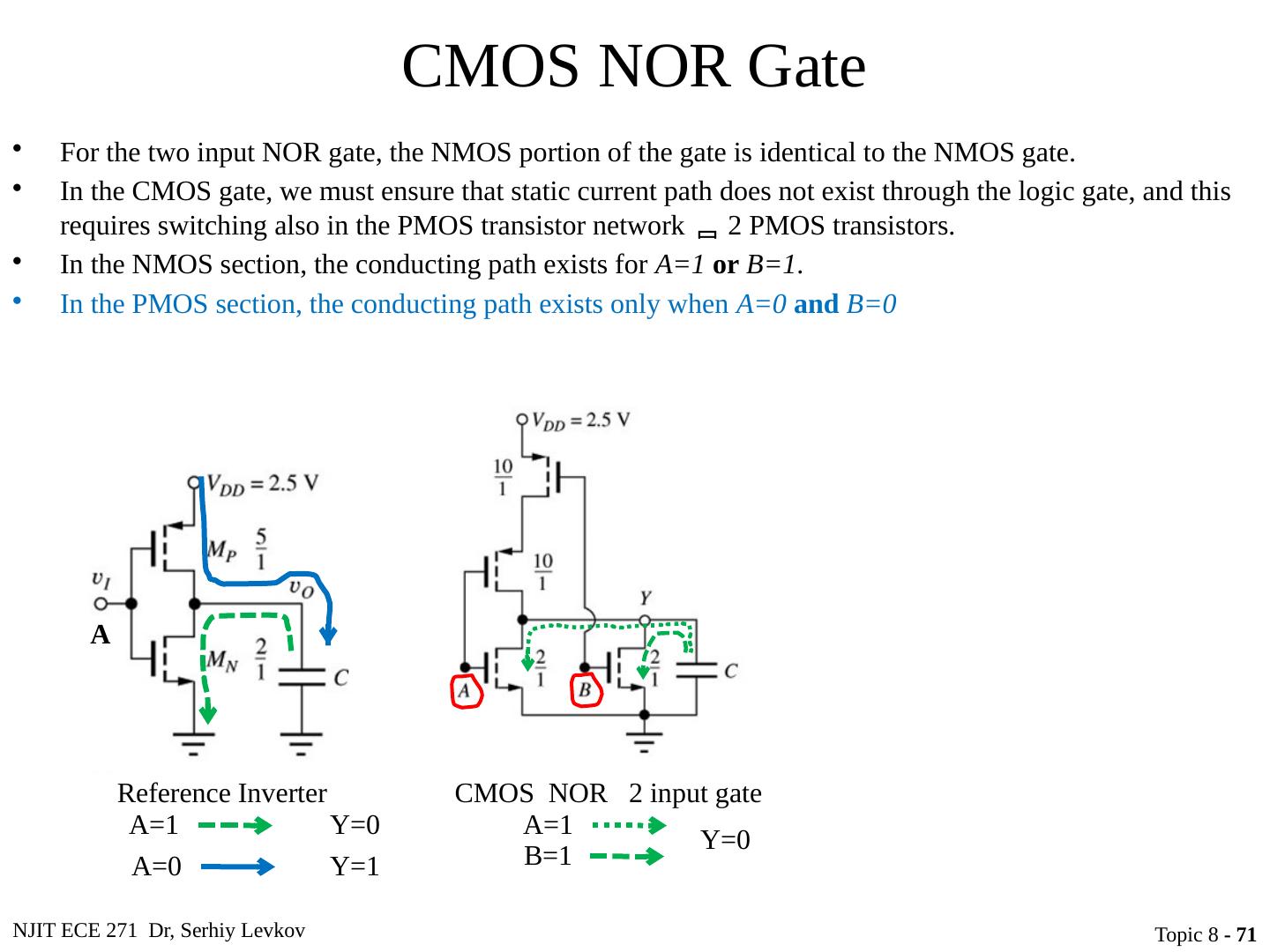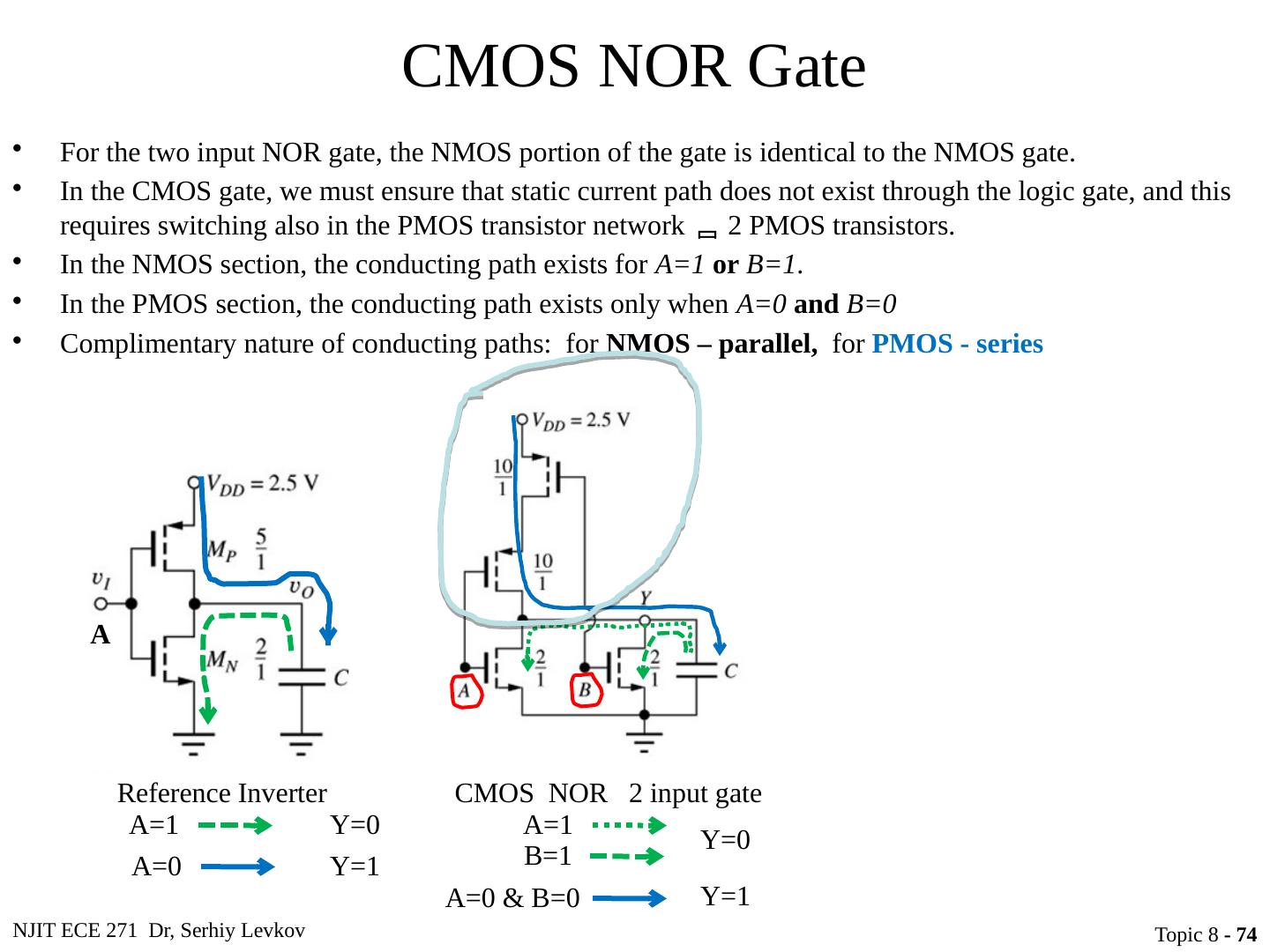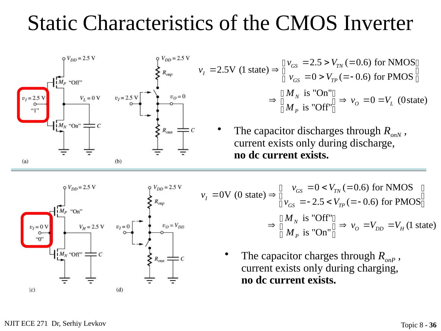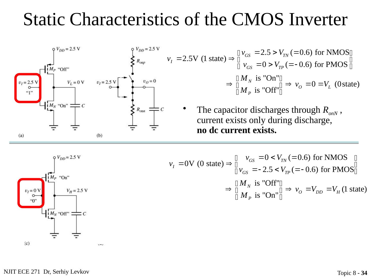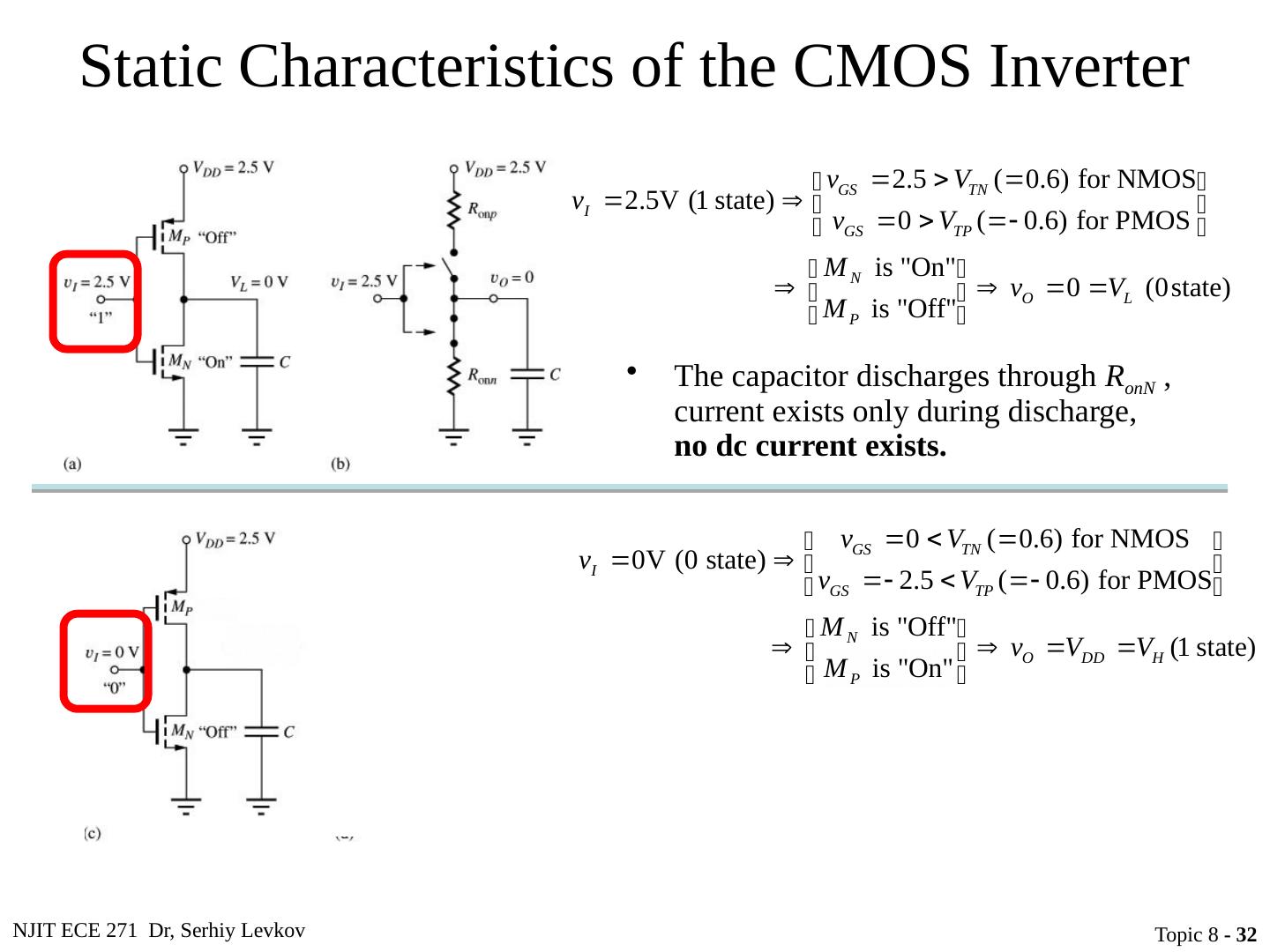 27 .NJIT ECE 271 Dr, Serhiy Levkov Topic 8 - 27 Static States of the CMOS Inverter The capacitor discharges through R onN , current exists only during discharge, no dc current exists .