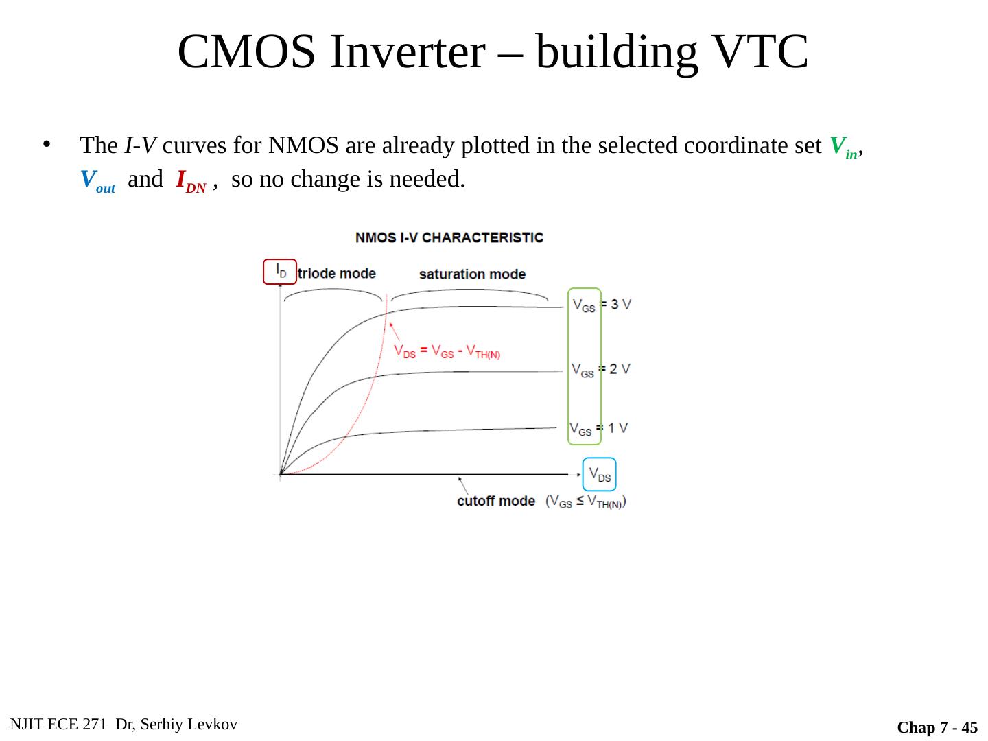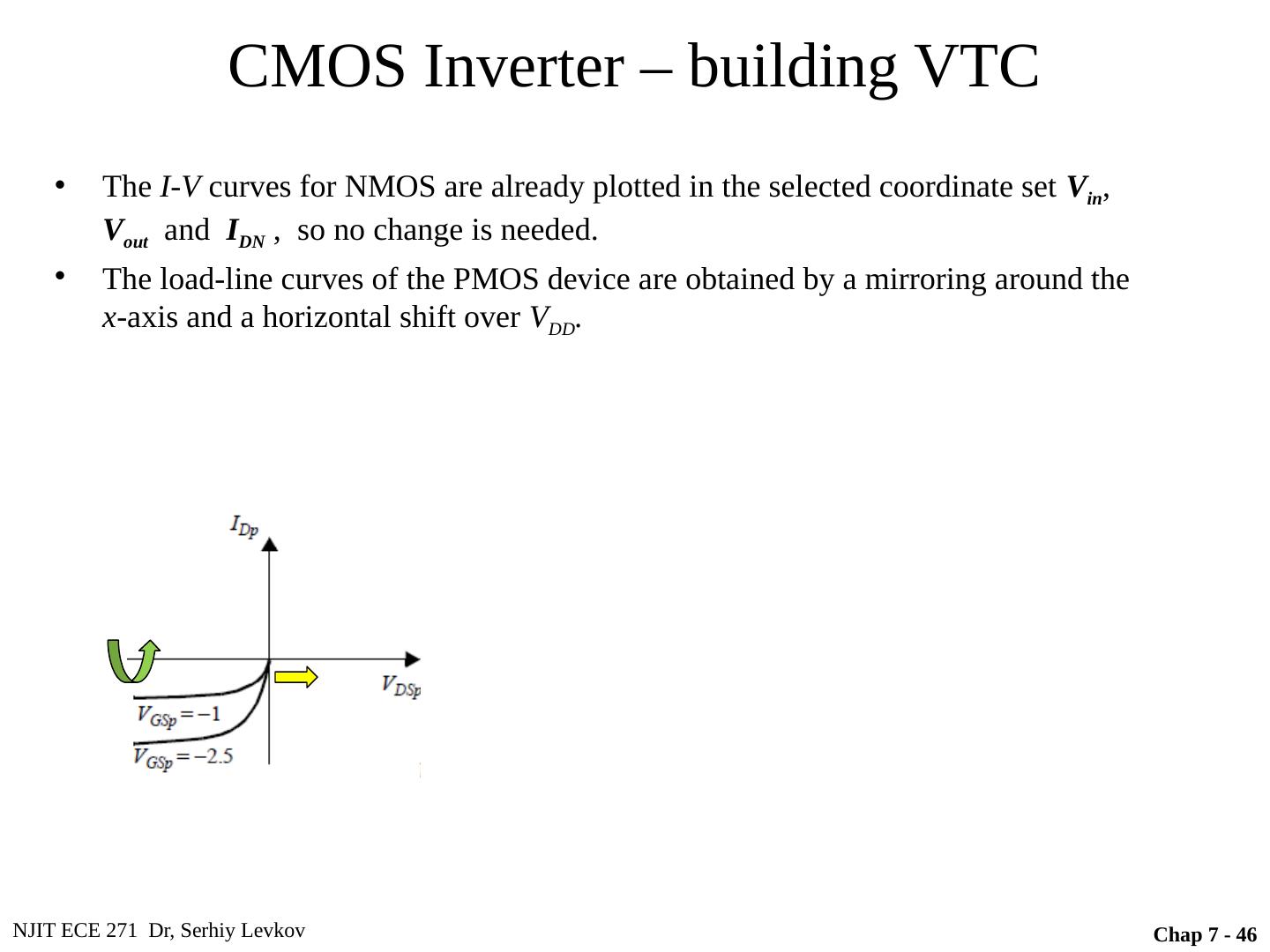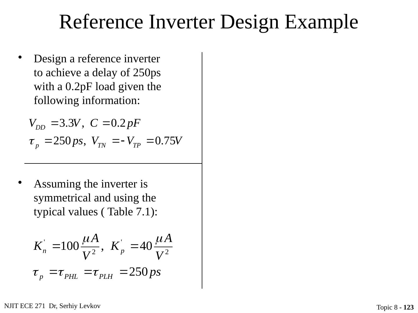 6 .NJIT ECE 271 Dr, Serhiy Levkov Topic 8 - 6 CMOS Inverter Circuit schematic for a CMOS inverter Simplified operation model with a high input applied Simplified operation model with a low input applied When v I is pulled high (to V DD ), the PMOS transistor is turned off, while the NMOS device is turned on pulling the output down to V SS When v I is pulled low (to V SS ), the NMOS transistor is turned off, while the PMOS device is turned on pulling the output up to V DD