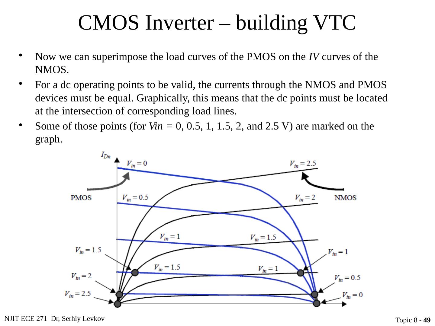 28 .NJIT ECE 271 Dr, Serhiy Levkov Topic 8 - 28 Static Characteristics of the CMOS Inverter The capacitor discharges through R onN , current exists only during discharge, no dc current exists. The capacitor charges through R onP , current exists only during charging, no dc current exists.