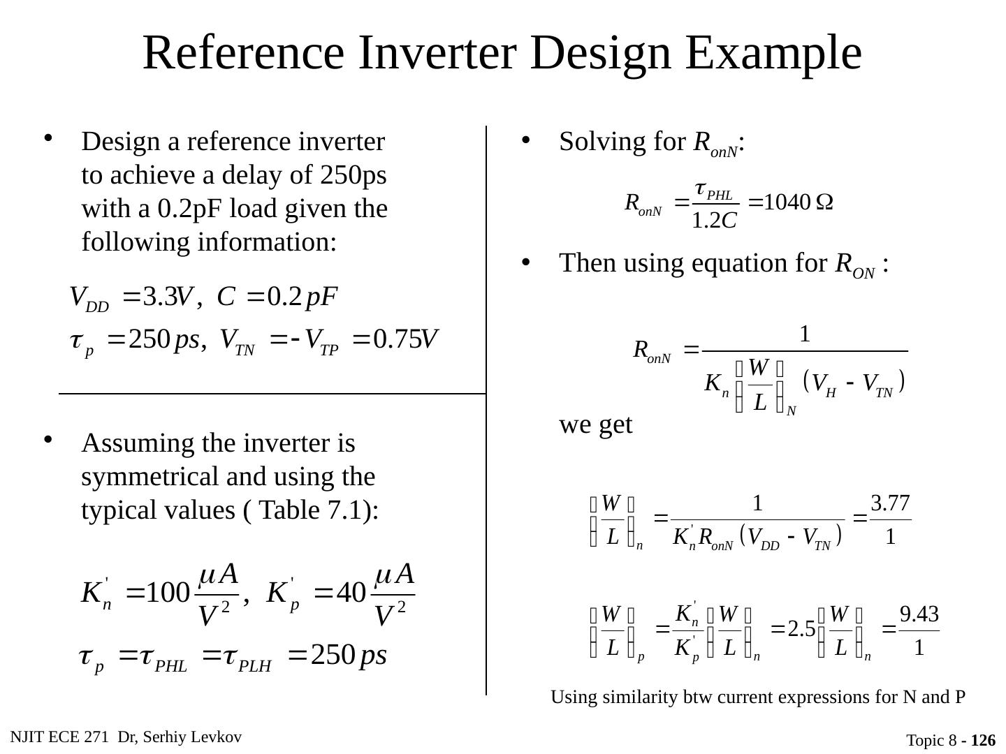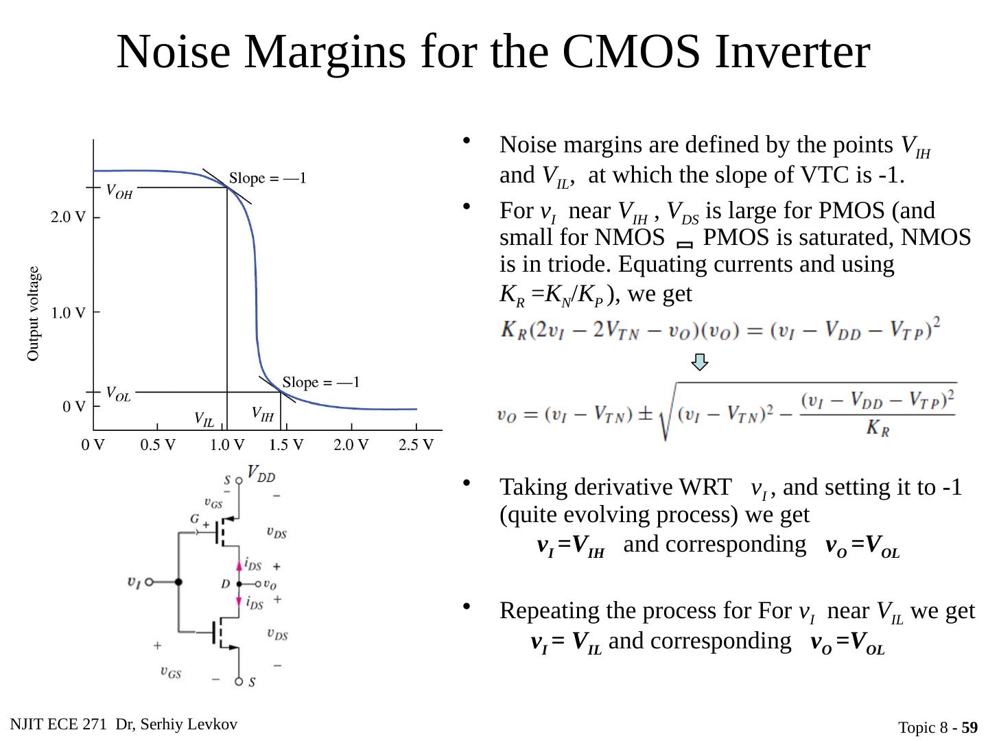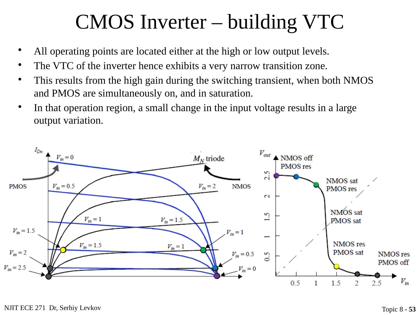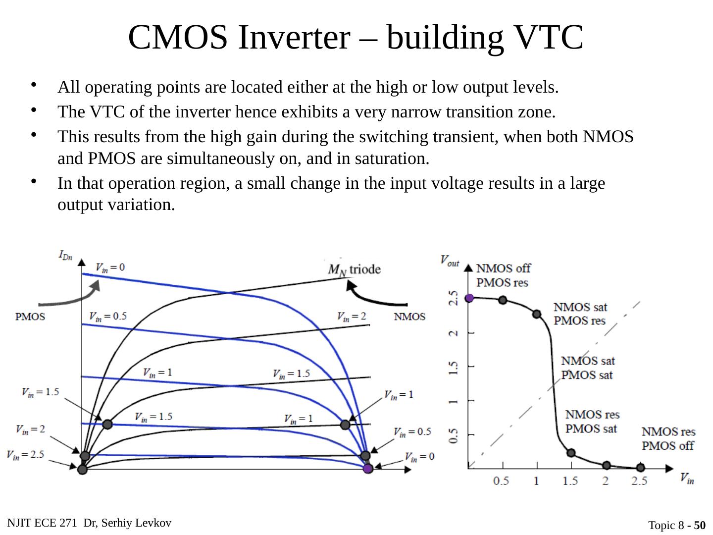 29 .NJIT ECE 271 Dr, Serhiy Levkov Topic 8 - 29 Static Characteristics of the CMOS Inverter The capacitor discharges through R onN , current exists only during discharge, no dc current exists. The capacitor charges through R onP , current exists only during charging, no dc current exists.