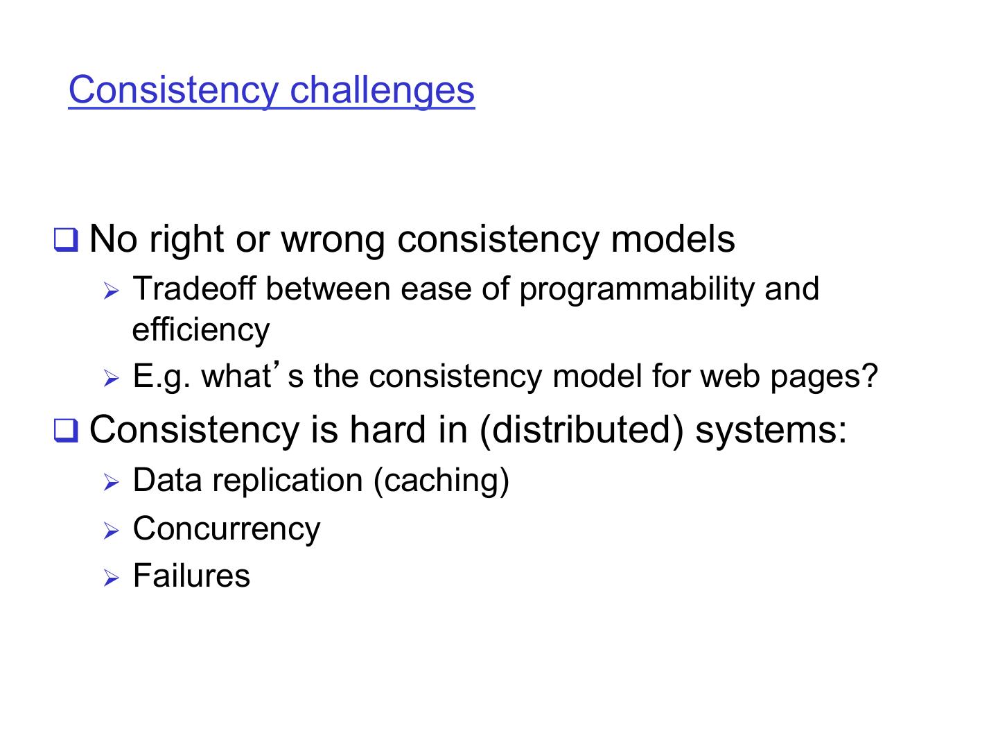 7 . Consistency challenges q No right or wrong consistency models Ø Tradeoff between ease of programmability and efficiency Ø E.g. what’s the consistency model for web pages? q Consistency is hard in (distributed) systems: Ø Data replication (caching) Ø Concurrency Ø Failures
