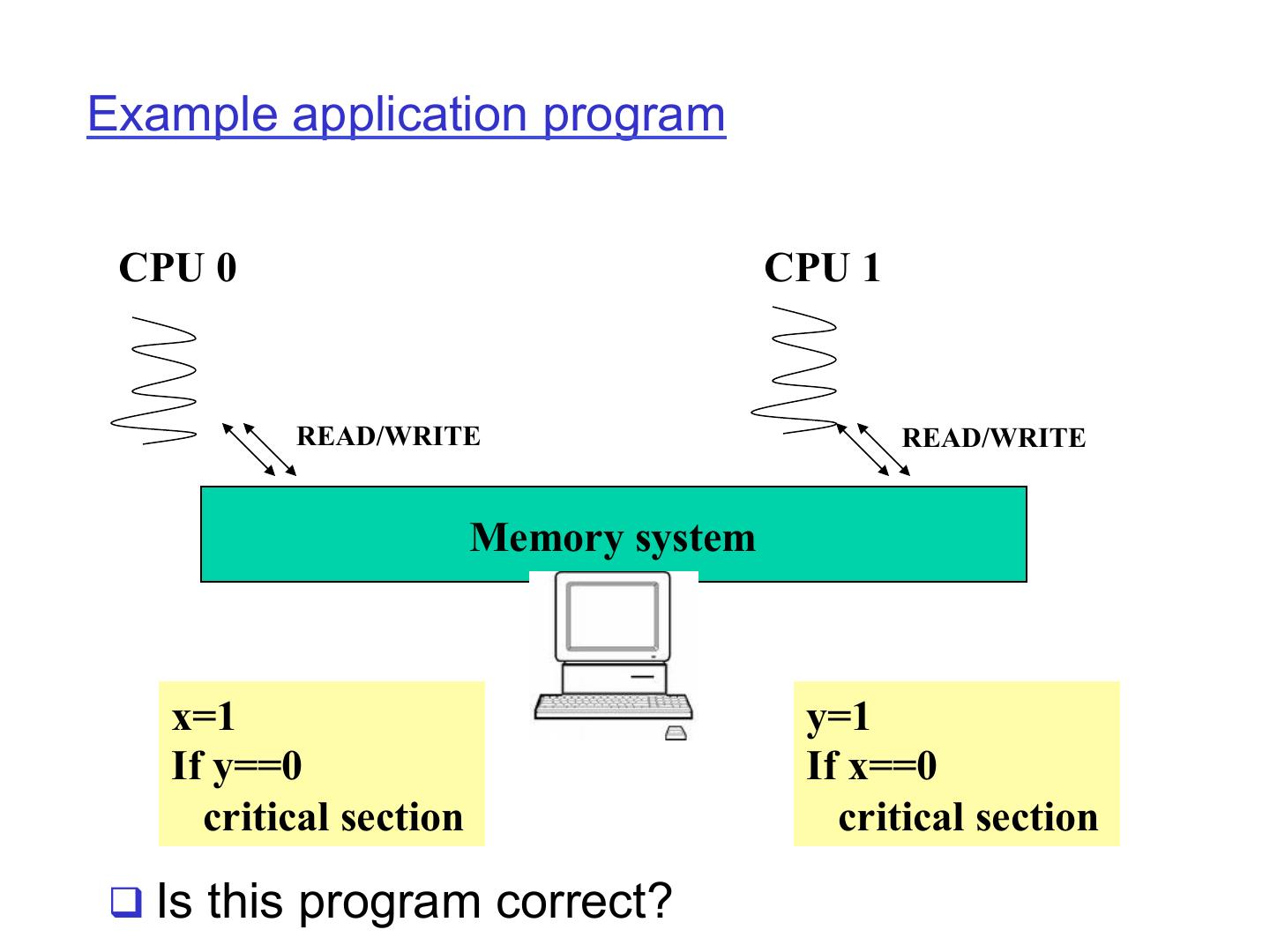 8 .Example application program CPU 0 CPU 1 READ/WRITE READ/WRITE Memory system x=1 y=1 If y==0 If x==0 critical section critical section q Is this program correct?