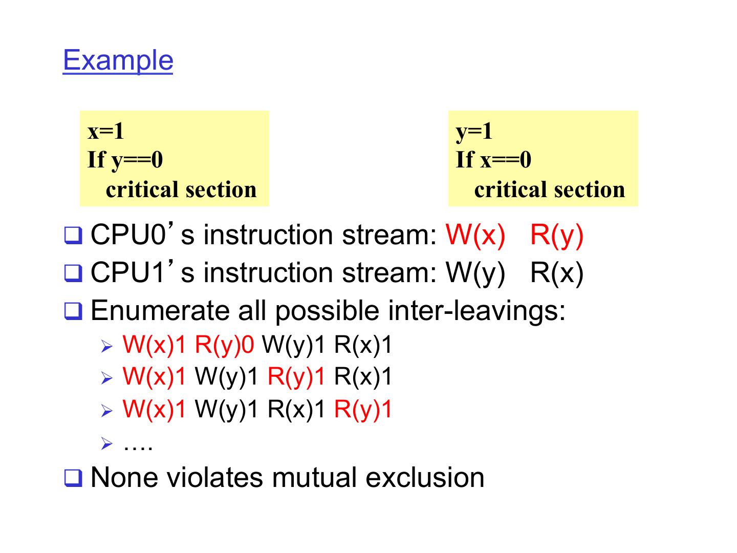 9 .Example x=1 y=1 If y==0 If x==0 critical section critical section q CPU0’s instruction stream: W(x) R(y) q CPU1’s instruction stream: W(y) R(x) q Enumerate all possible inter-leavings: Ø W(x)1 R(y)0 W(y)1 R(x)1 Ø W(x)1 W(y)1 R(y)1 R(x)1 Ø W(x)1 W(y)1 R(x)1 R(y)1 Ø …. q None violates mutual exclusion