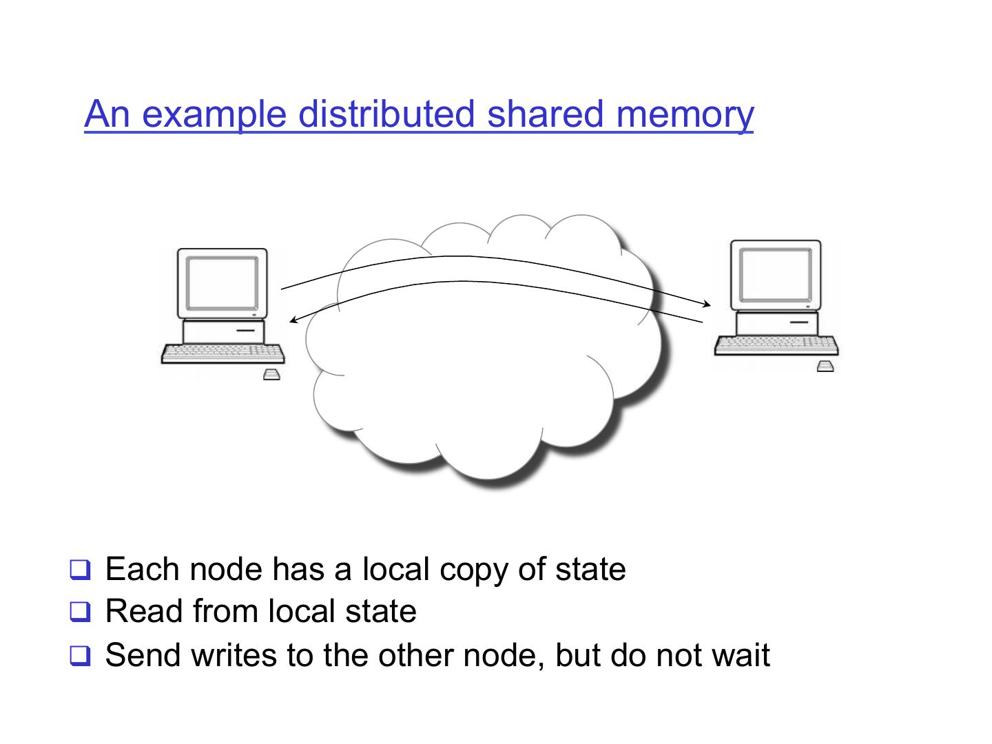 10 . An example distributed shared memory q Each node has a local copy of state q Read from local state q Send writes to the other node, but do not wait