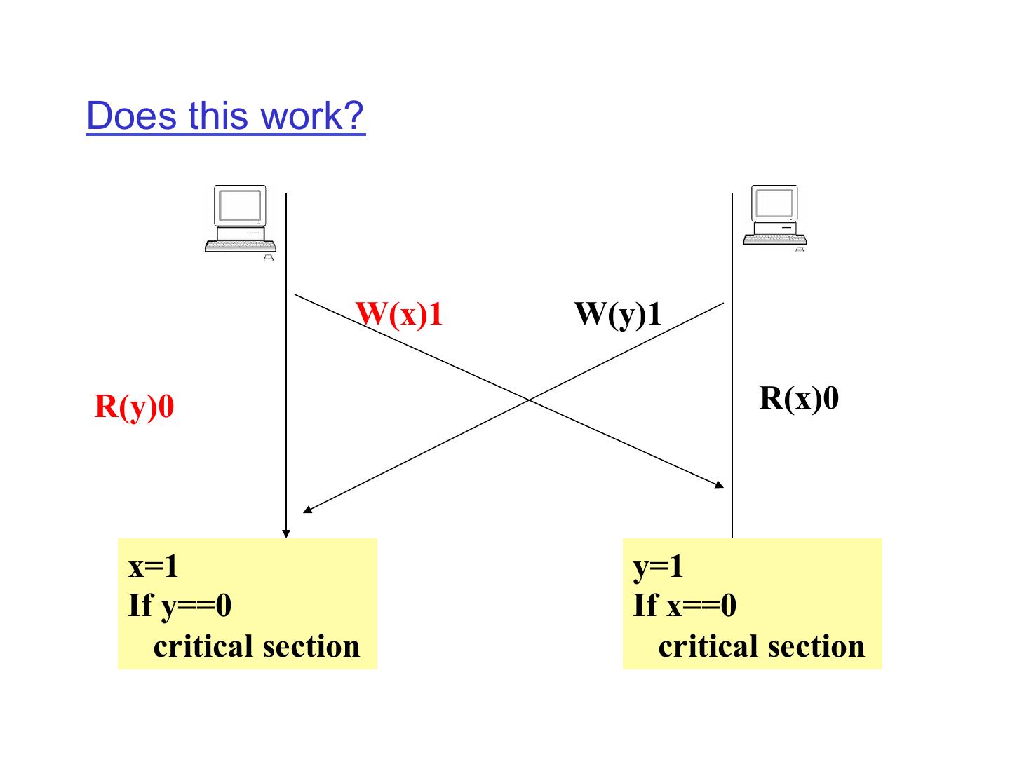 12 .Does this work? W(x)1 W(y)1 R(y)0 R(x)0 x=1 y=1 If y==0 If x==0 critical section critical section