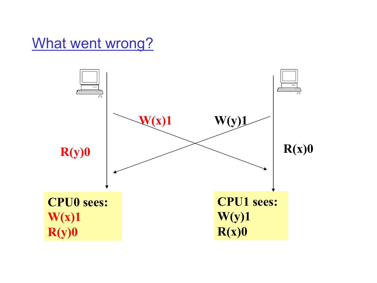 13 .What went wrong? W(x)1 W(y)1 R(y)0 R(x)0 CPU0 sees: CPU1 sees: W(x)1 W(y)1 R(y)0 R(x)0