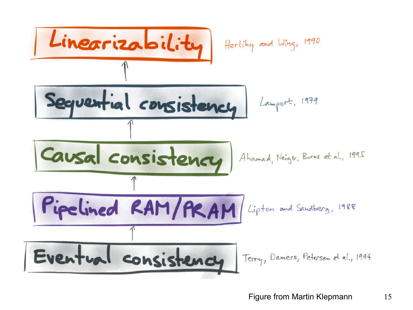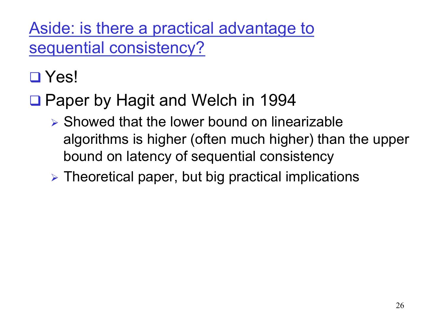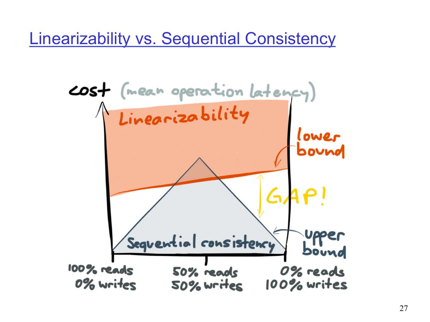 26 .Aside: is there a practical advantage to sequential consistency? q Yes! q Paper by Hagit and Welch in 1994 Ø Showed that the lower bound on linearizable algorithms is higher (often much higher) than the upper bound on latency of sequential consistency Ø Theoretical paper, but big practical implications 26