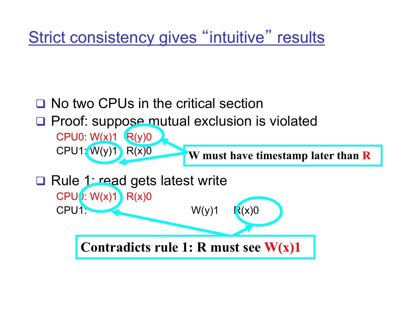 17 .Strict consistency gives “intuitive” results q No two CPUs in the critical section q Proof: suppose mutual exclusion is violated CPU0: W(x)1 R(y)0 CPU1: W(y)1 R(x)0 W must have timestamp later than R q Rule 1: read gets latest write CPU0: W(x)1 R(x)0 CPU1: W(y)1 R(x)0 Contradicts rule 1: R must see W(x)1