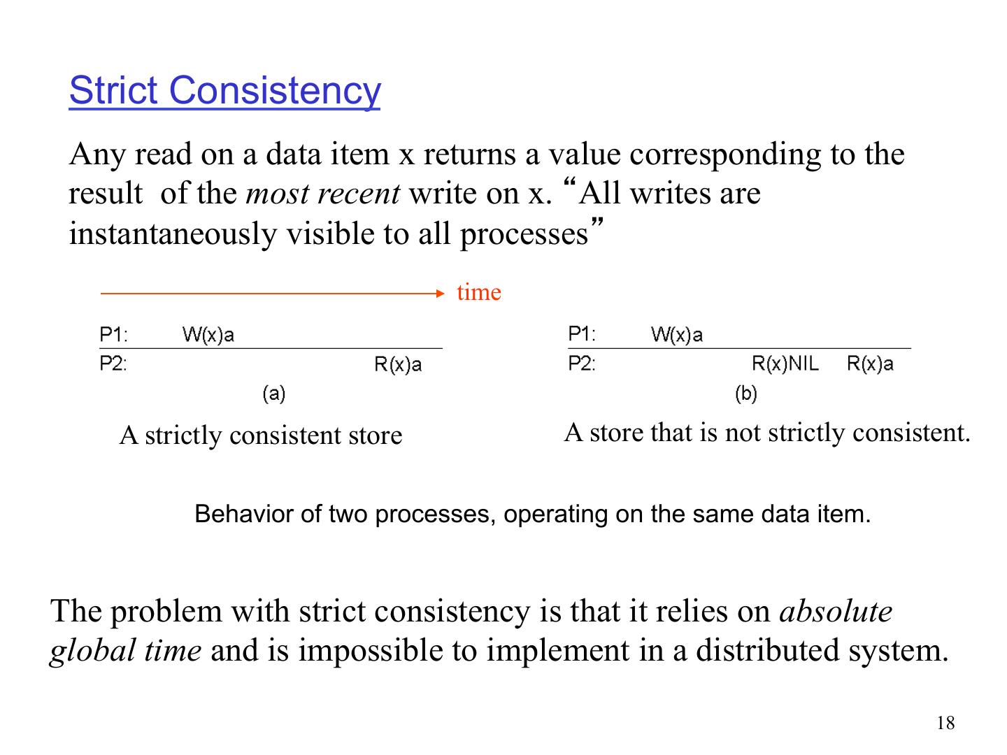 18 . Strict Consistency Any read on a data item x returns a value corresponding to the result of the most recent write on x. “All writes are instantaneously visible to all processes” time A strictly consistent store A store that is not strictly consistent. Behavior of two processes, operating on the same data item. The problem with strict consistency is that it relies on absolute global time and is impossible to implement in a distributed system. 18