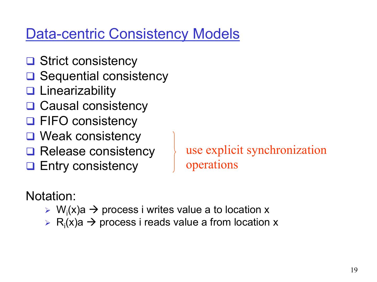 19 .Data-centric Consistency Models q Strict consistency q Sequential consistency q Linearizability q Causal consistency q FIFO consistency q Weak consistency q Release consistency use explicit synchronization q Entry consistency operations Notation: Ø Wi(x)a à process i writes value a to location x Ø Ri(x)a à process i reads value a from location x 19