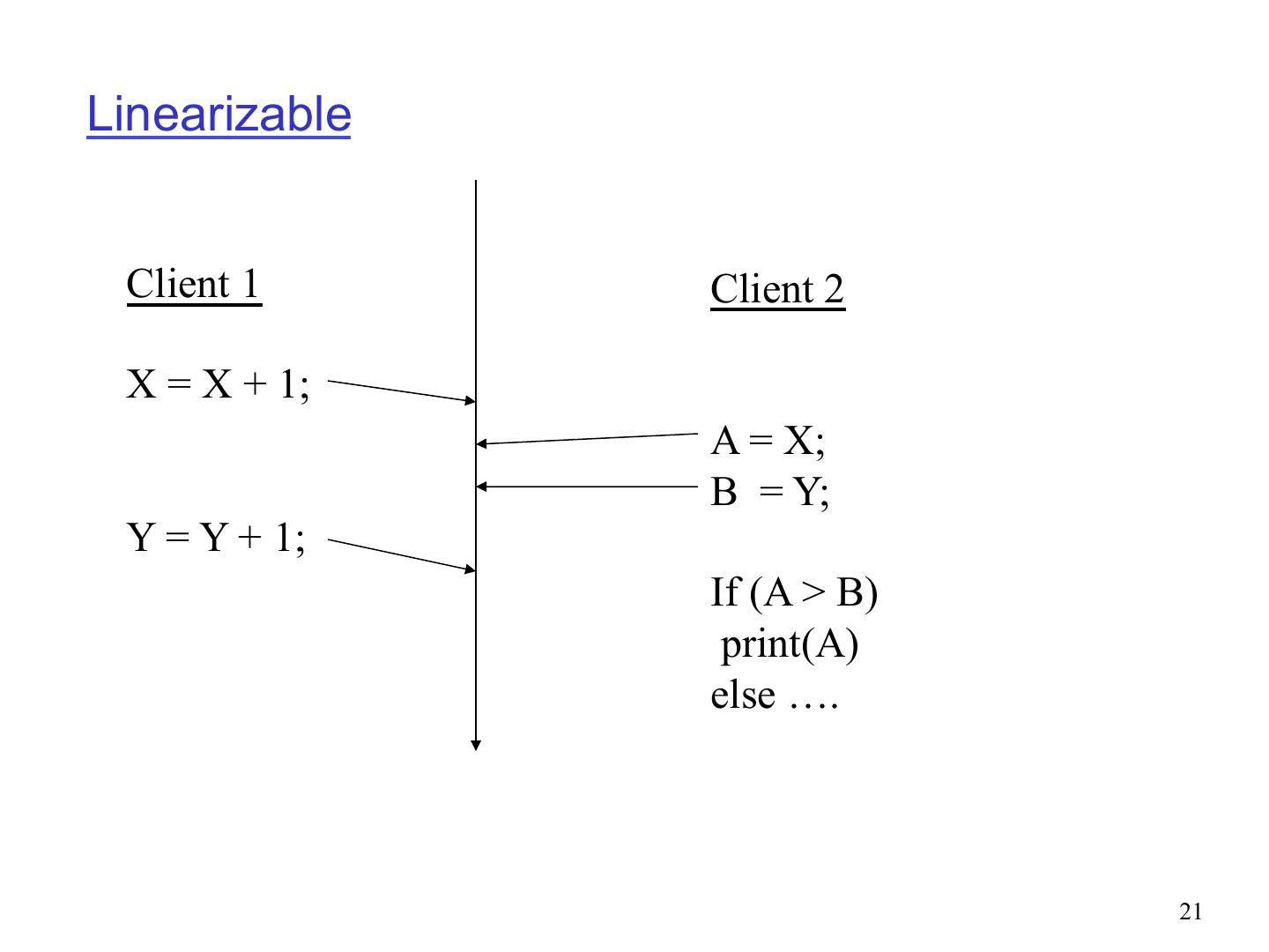 21 .Linearizable Client 1 Client 2 X = X + 1; A = X; B = Y; Y = Y + 1; If (A > B) print(A) else …. 21