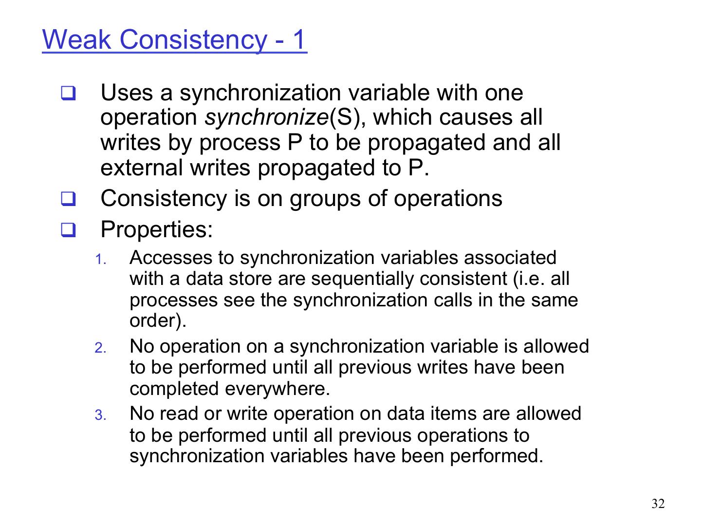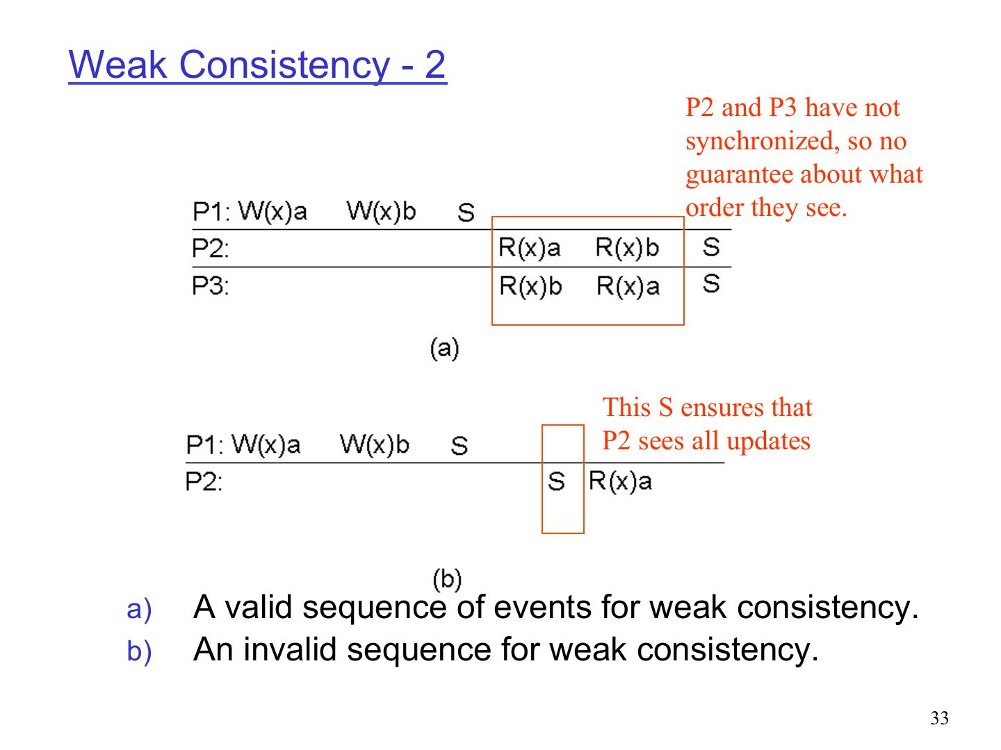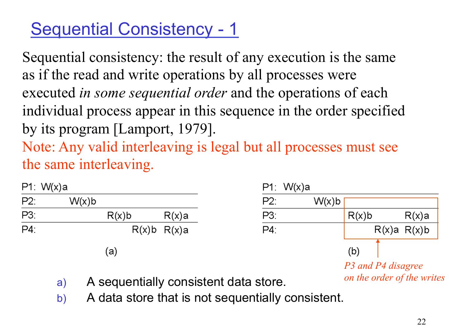 22 . Sequential Consistency - 1 Sequential consistency: the result of any execution is the same as if the read and write operations by all processes were executed in some sequential order and the operations of each individual process appear in this sequence in the order specified by its program [Lamport, 1979]. Note: Any valid interleaving is legal but all processes must see the same interleaving. P3 and P4 disagree on the order of the writes a) A sequentially consistent data store. b) A data store that is not sequentially consistent. 22