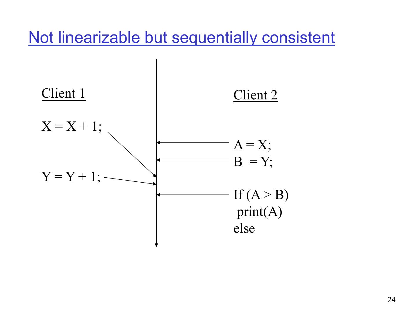 24 .Not linearizable but sequentially consistent Client 1 Client 2 X = X + 1; A = X; B = Y; Y = Y + 1; If (A > B) print(A) else 24
