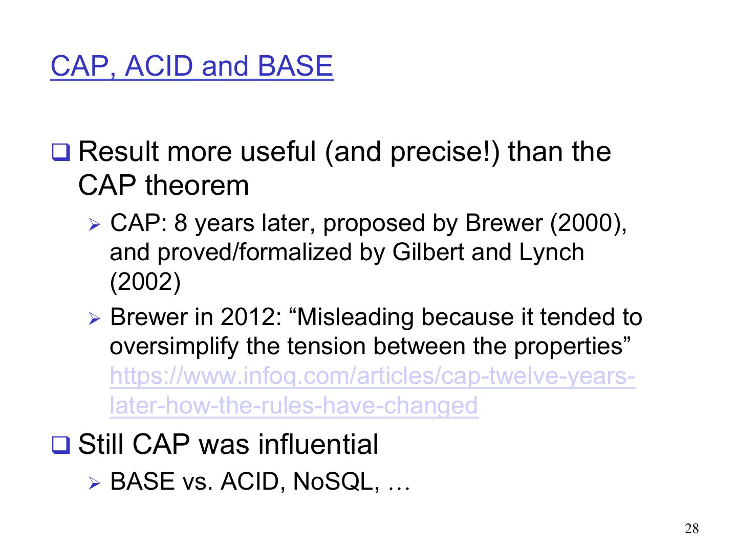 28 .CAP, ACID and BASE q Result more useful (and precise!) than the CAP theorem Ø CAP: 8 years later, proposed by Brewer (2000), and proved/formalized by Gilbert and Lynch (2002) Ø Brewer in 2012: “Misleading because it tended to oversimplify the tension between the properties” https://www.infoq.com/articles/cap-twelve-years- later-how-the-rules-have-changed q Still CAP was influential Ø BASE vs. ACID, NoSQL, … 28