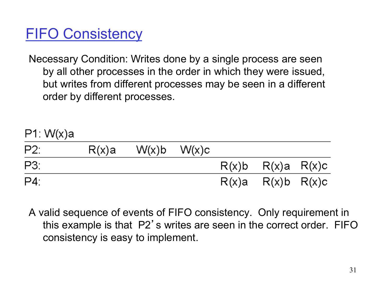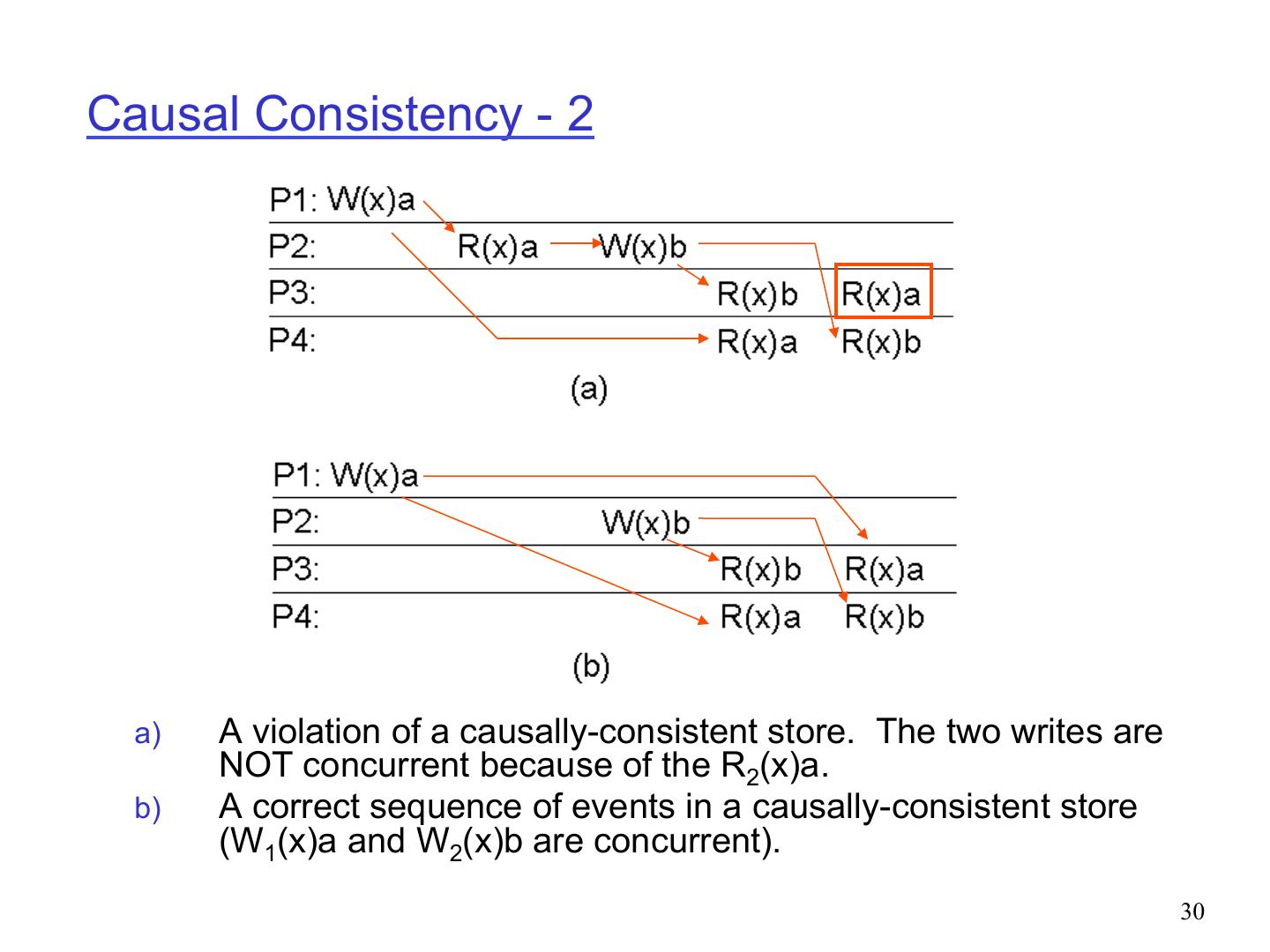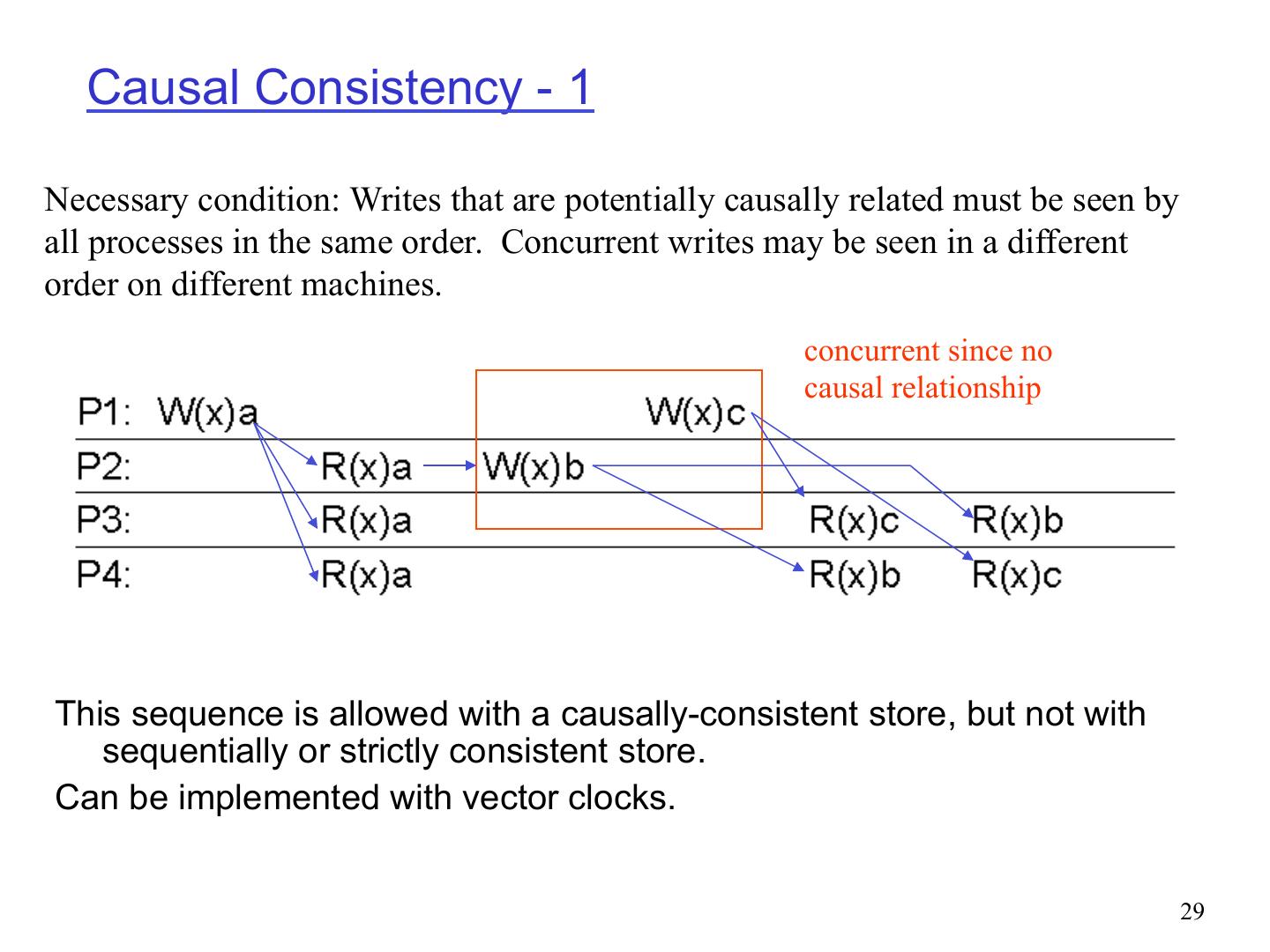 29 . Causal Consistency - 1 Necessary condition: Writes that are potentially causally related must be seen by all processes in the same order. Concurrent writes may be seen in a different order on different machines. concurrent since no causal relationship This sequence is allowed with a causally-consistent store, but not with sequentially or strictly consistent store. Can be implemented with vector clocks. 29