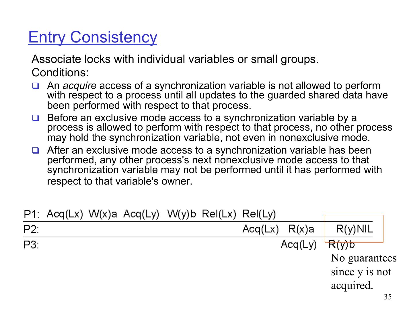 23 . Sequential Consistency - 2 Process P1 Process P2 Process P3 x = 1; y = 1; z = 1; print ( y, z); print (x, z); print (x, y); x = 1; x = 1; y = 1; y = 1; print (y, z); y = 1; z = 1; x = 1; y = 1; print (x,z); print (x, y); z = 1; print (x, z); print(y, z); print (x, z); print (x, z); z = 1; z = 1; x = 1; print (y, z); print (x, y); print (x, y); print (y, z); print (x, y); Prints: 001011 Prints: 101011 Prints: 010111 Prints: 111111 (a) (b) (c) (d) (a)-(d) are all legal interleavings. 23