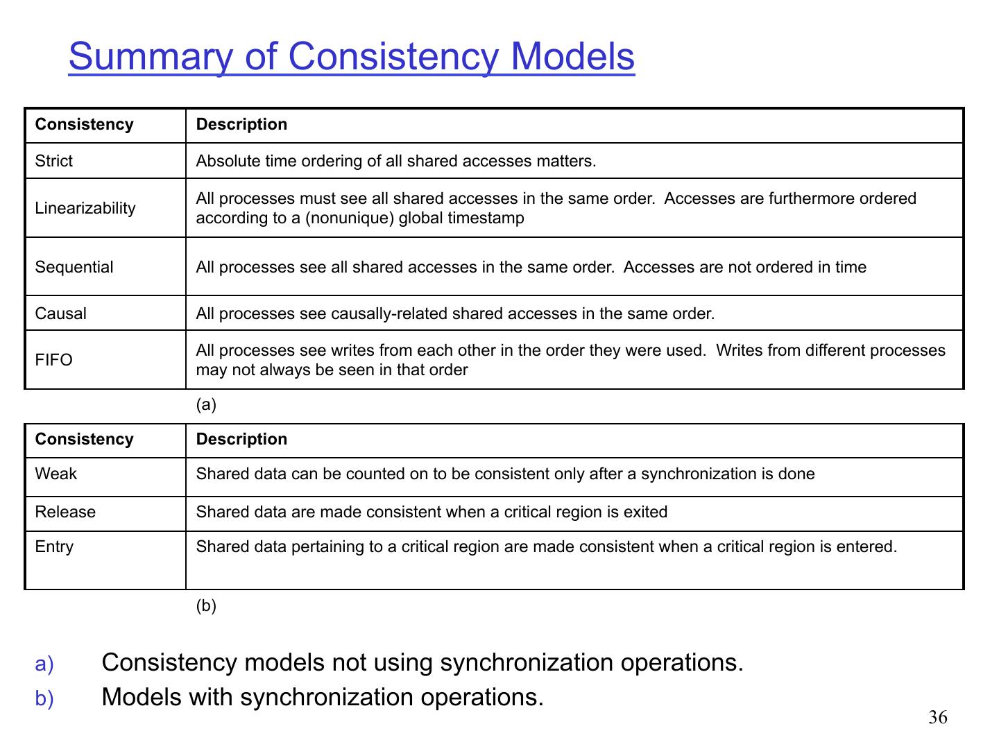 3 .Consistency Models q Consistency Model is a contract between processes and a data store Ø if processes follow certain rules, then store will work “correctly” q Needed for understanding how concurrent reads and writes behave with respect to shared data q Relevant for shared memory multiprocessors Ø cache coherence algorithms q Shared databases, files Ø independent operations § our main focus in the rest of the lecture Ø transactions 3