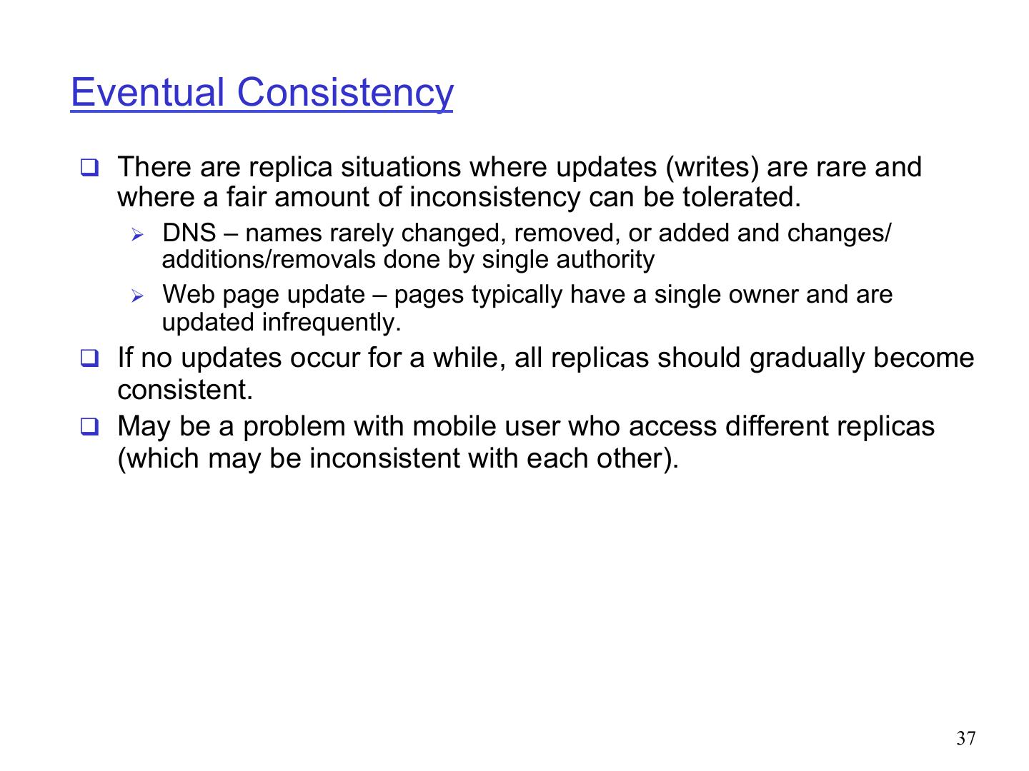 2 .Replication q Motivation Ø Performance Enhancement Ø Enhanced availability Ø Fault tolerance Ø Scalability § tradeoff between benefits of replication and work required to keep replicas consistent q Requirements Ø Consistency § Depends upon application § In many applications, we want that different clients making (read/ write) requests to different replicas of the same logical data item should not obtain different results Ø Replica transparency § desirable for most applications 2