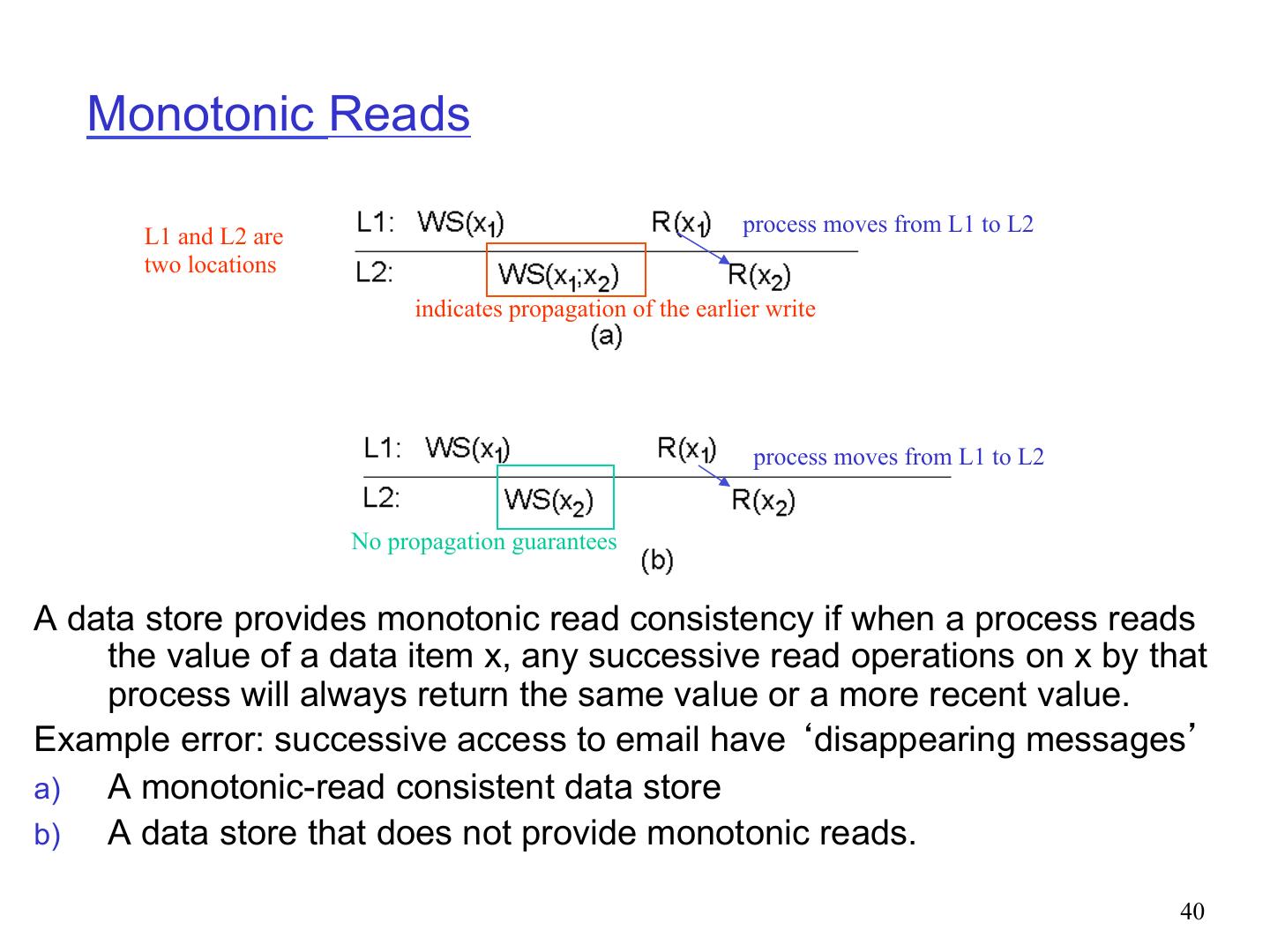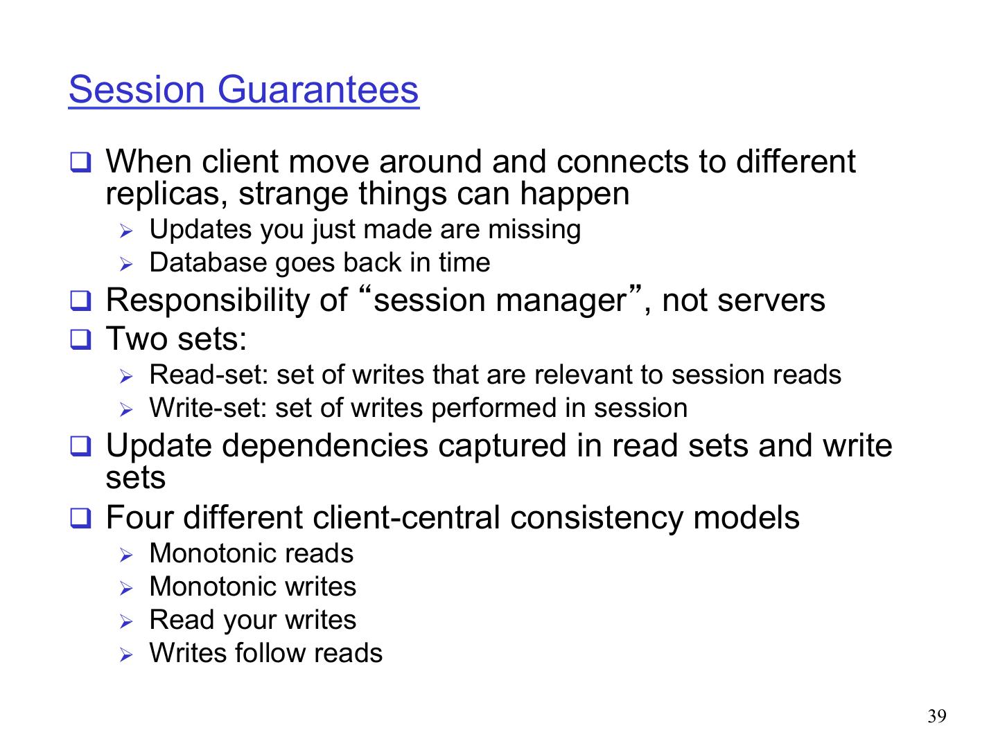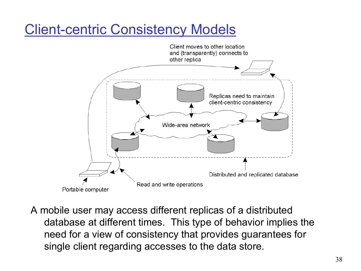 5 .Client-centric Consistency Models A mobile user may access different replicas of a distributed database at different times. This type of behavior implies the need for a view of consistency that provides guarantees for single client regarding accesses to the data store. 5