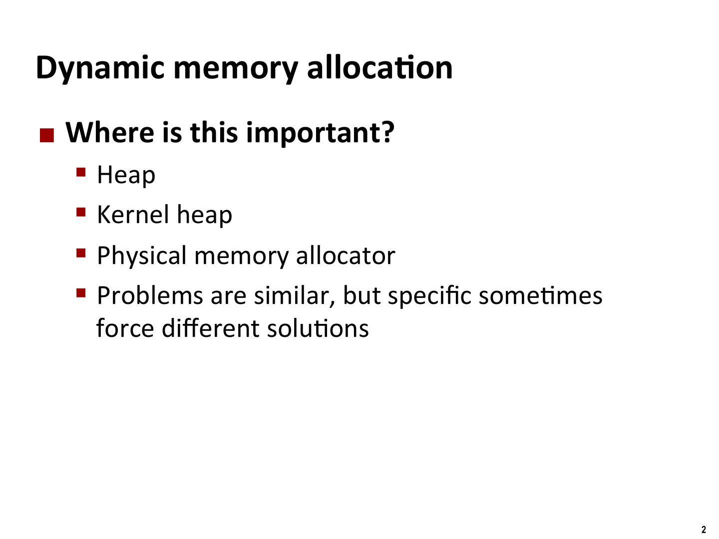 2 . Binghamton University Dynamic memory alloca/on ¢ Where is this important? § Heap § Kernel heap § Physical memory allocator § Problems are similar, but specific some/mes force different solu/ons 2