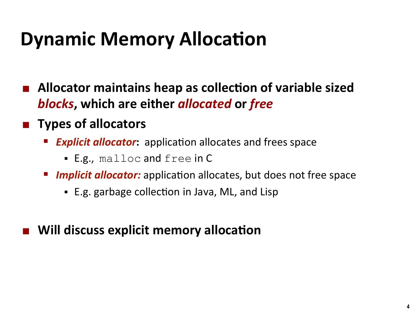 4 . Binghamton University Dynamic Memory Alloca/on ¢ Allocator maintains heap as collec/on of variable sized blocks, which are either allocated or free ¢ Types of allocators § Explicit allocator: applica/on allocates and frees space § E.g., malloc and free in C § Implicit allocator: applica/on allocates, but does not free space § E.g. garbage collec/on in Java, ML, and Lisp ¢ Will discuss explicit memory alloca/on 4