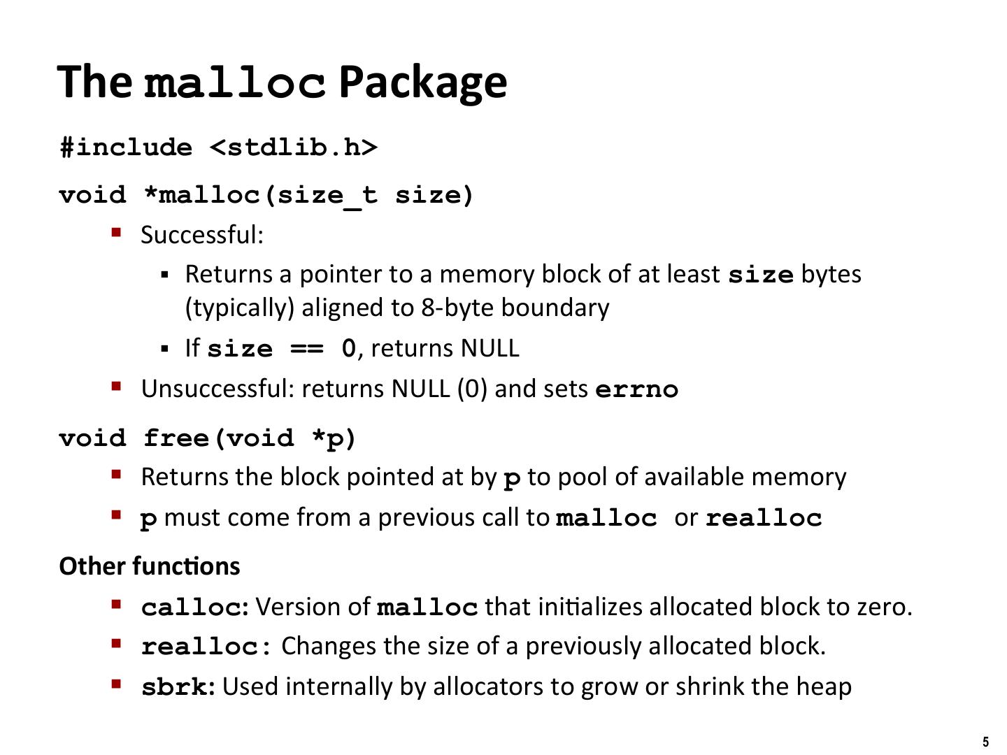5 . Binghamton University The malloc Package #include <stdlib.h> void *malloc(size_t size) § Successful: § Returns a pointer to a memory block of at least size bytes (typically) aligned to 8-byte boundary § If size == 0, returns NULL § Unsuccessful: returns NULL (0) and sets errno void free(void *p) § Returns the block pointed at by p to pool of available memory § p must come from a previous call to malloc or realloc Other func/ons § calloc: Version of malloc that ini/alizes allocated block to zero. § realloc: Changes the size of a previously allocated block. § sbrk: Used internally by allocators to grow or shrink the heap 5