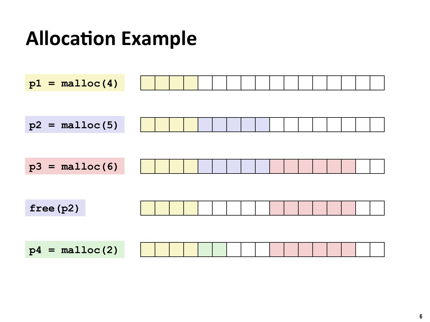 6 . Binghamton University Alloca/on Example p1 = malloc(4) p2 = malloc(5) p3 = malloc(6) free(p2) p4 = malloc(2) 6