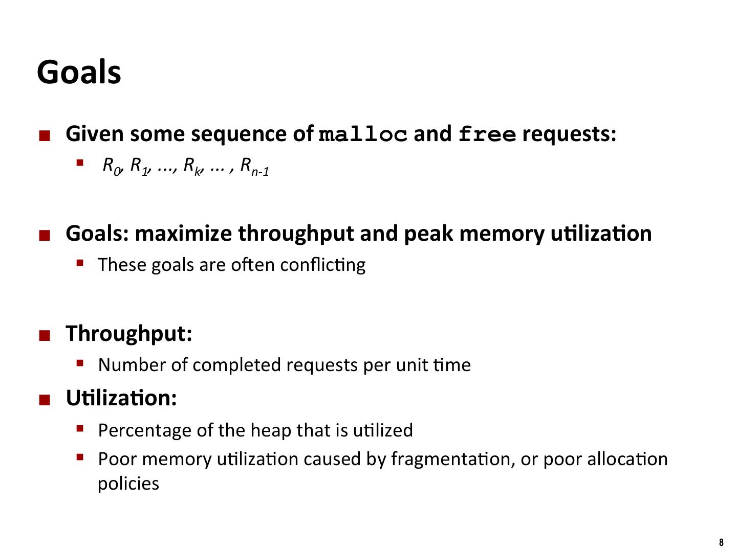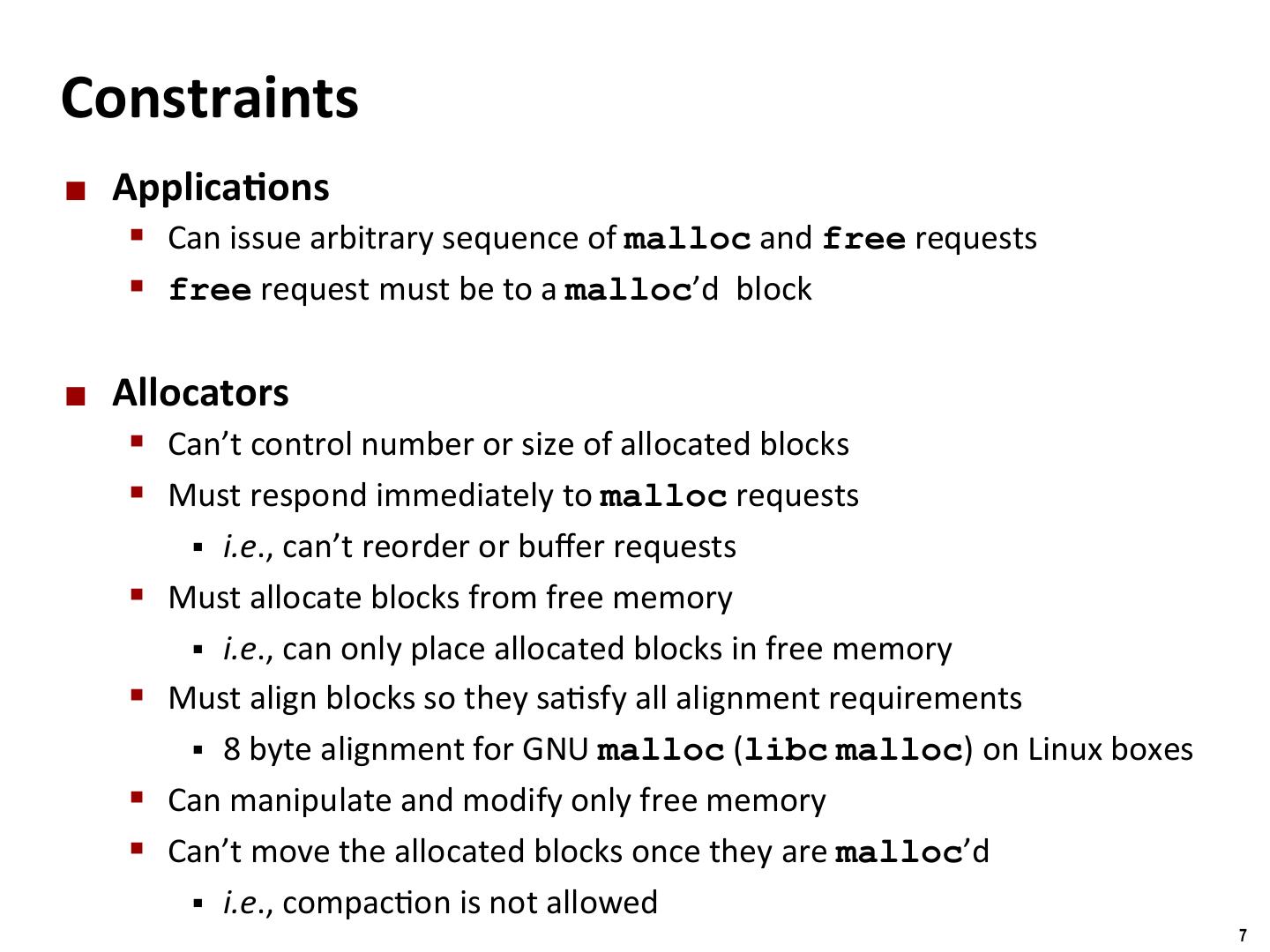 7 . Binghamton University Constraints ¢ Applica/ons § Can issue arbitrary sequence of malloc and free requests § free request must be to a malloc’d block ¢ Allocators § Can’t control number or size of allocated blocks § Must respond immediately to malloc requests § i.e., can’t reorder or buffer requests § Must allocate blocks from free memory § i.e., can only place allocated blocks in free memory § Must align blocks so they sa/sfy all alignment requirements § 8 byte alignment for GNU malloc (libc malloc) on Linux boxes § Can manipulate and modify only free memory § Can’t move the allocated blocks once they are malloc’d § i.e., compac/on is not allowed 7