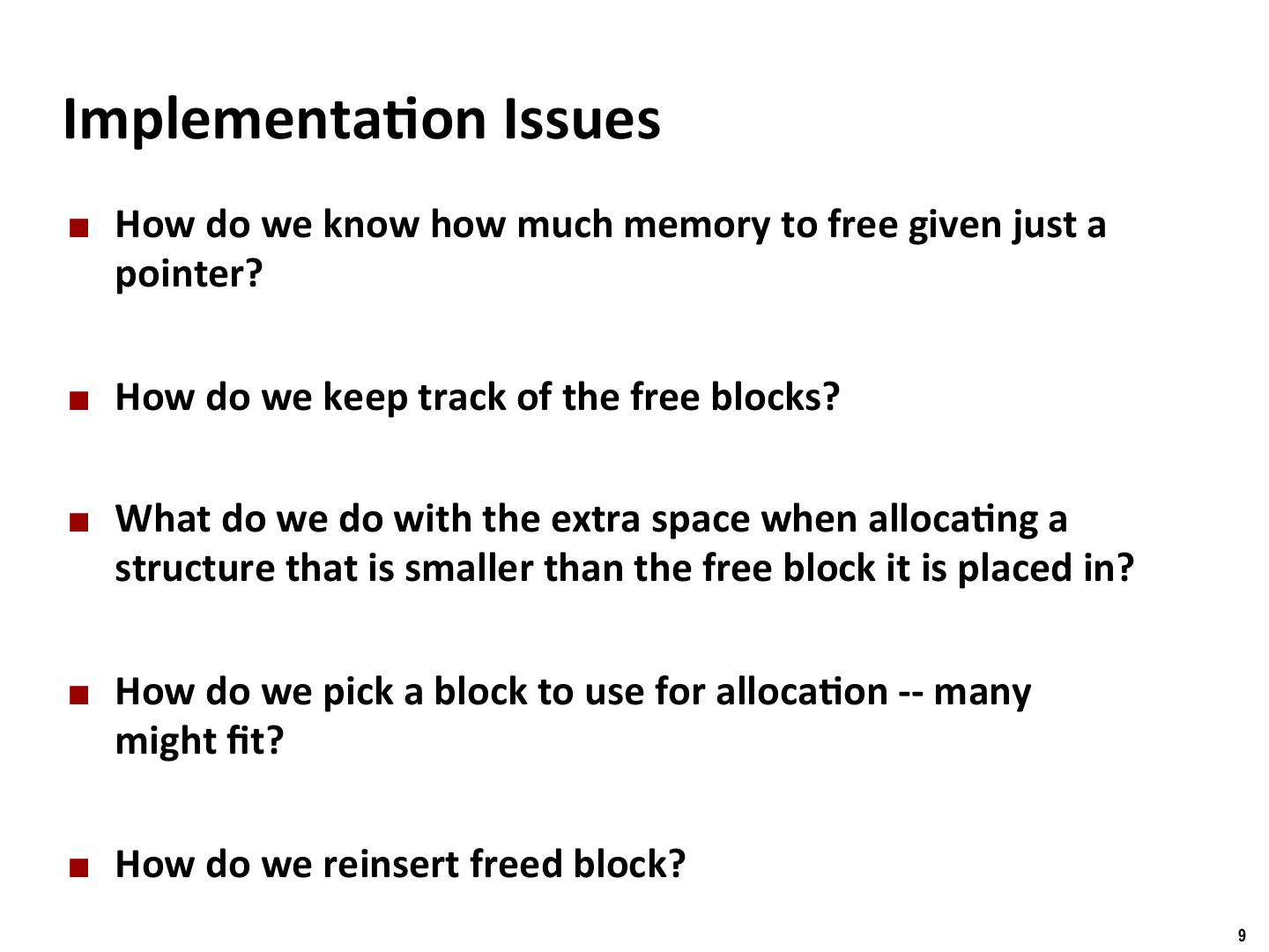 9 . Binghamton University Implementa/on Issues ¢ How do we know how much memory to free given just a pointer? ¢ How do we keep track of the free blocks? ¢ What do we do with the extra space when alloca/ng a structure that is smaller than the free block it is placed in? ¢ How do we pick a block to use for alloca/on -- many might fit? ¢ How do we reinsert freed block? 9