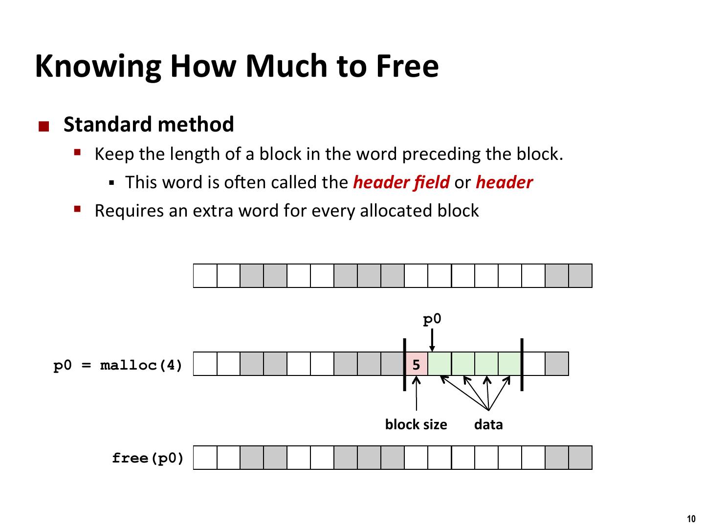 10 . Binghamton University Knowing How Much to Free ¢ Standard method § Keep the length of a block in the word preceding the block. § This word is o\en called the header field or header § Requires an extra word for every allocated block p0 p0 = malloc(4) 5 block size data free(p0) 10