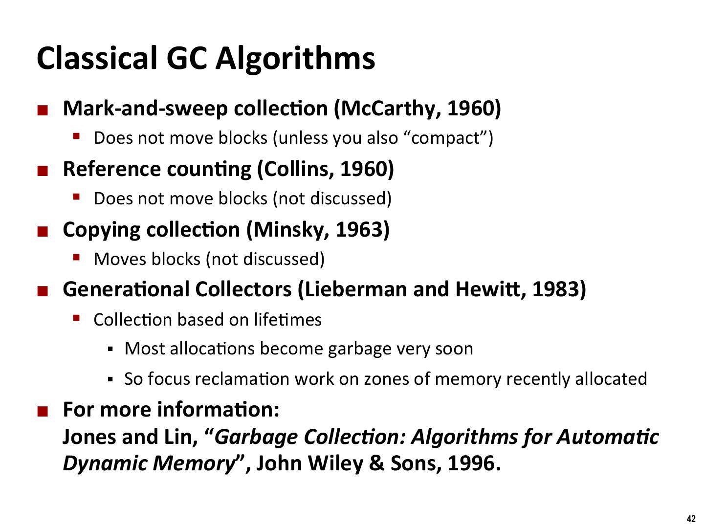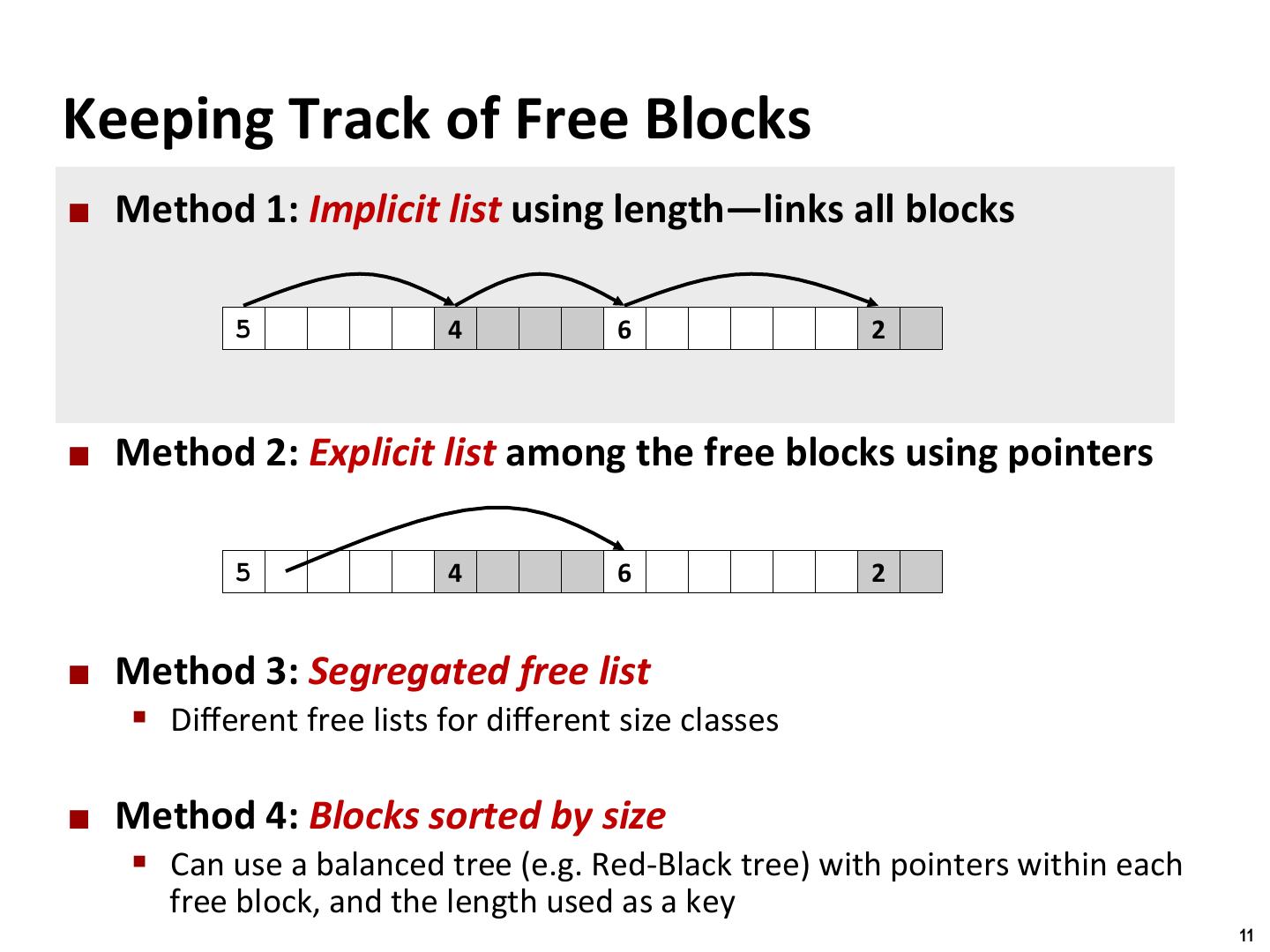 11 . Binghamton University Keeping Track of Free Blocks ¢ Method 1: Implicit list using length—links all blocks 5 4 6 2 ¢ Method 2: Explicit list among the free blocks using pointers 5 4 6 2 ¢ Method 3: Segregated free list § Different free lists for different size classes ¢ Method 4: Blocks sorted by size § Can use a balanced tree (e.g. Red-Black tree) with pointers within each free block, and the length used as a key 11