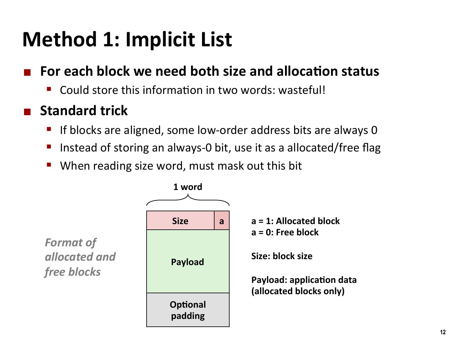 12 . Binghamton University Method 1: Implicit List ¢ For each block we need both size and alloca/on status § Could store this informa/on in two words: wasteful! ¢ Standard trick § If blocks are aligned, some low-order address bits are always 0 § Instead of storing an always-0 bit, use it as a allocated/free flag § When reading size word, must mask out this bit 1 word Size a a = 1: Allocated block a = 0: Free block Format of allocated and Payload Size: block size free blocks Payload: applica/on data (allocated blocks only) Op/onal padding 12