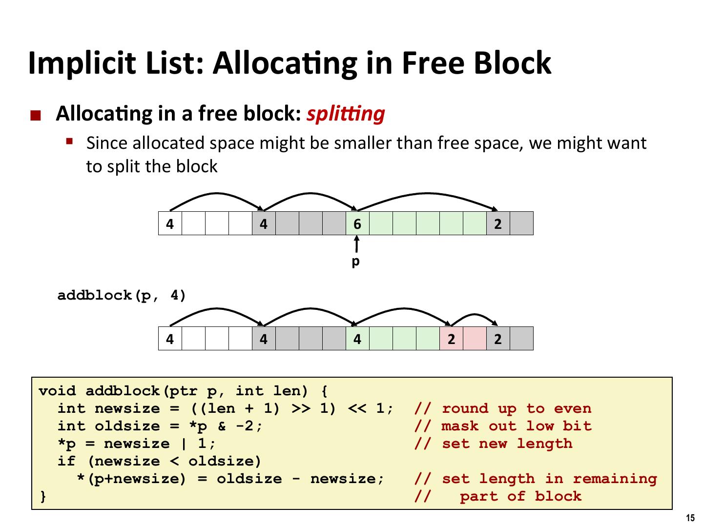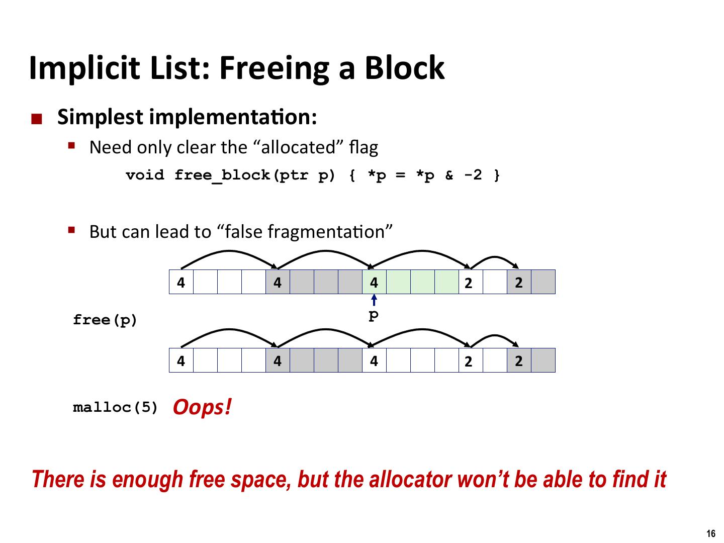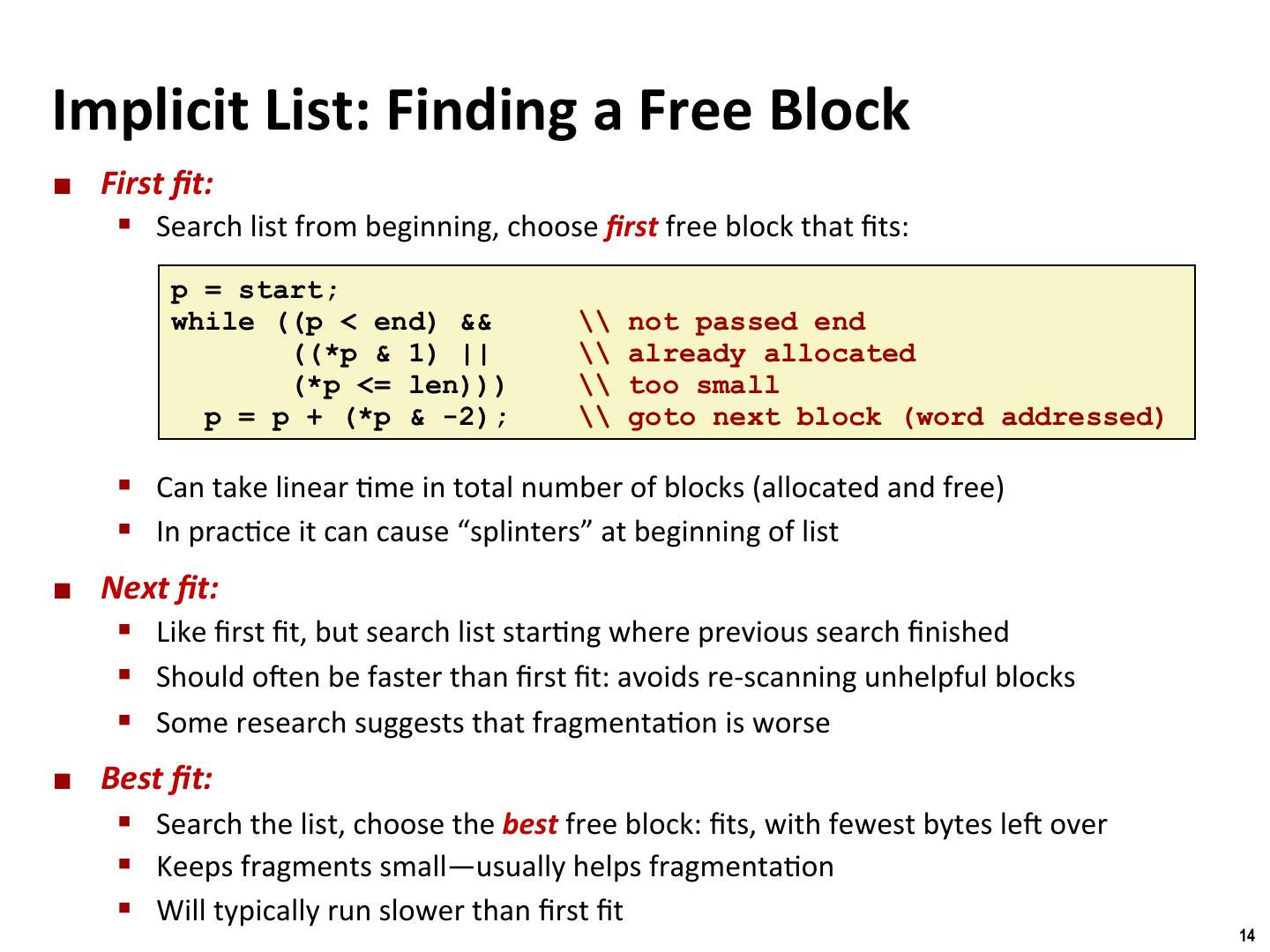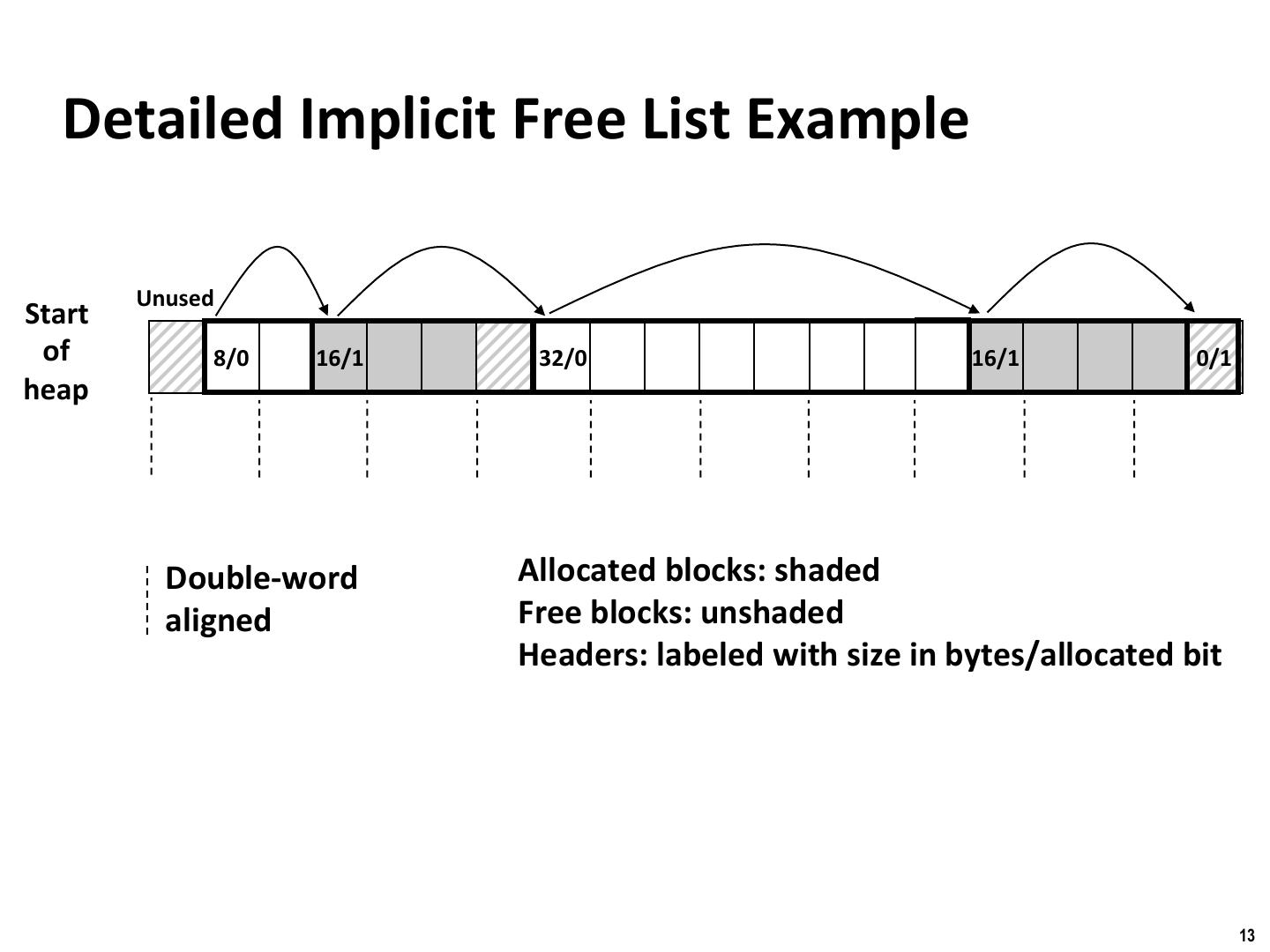 13 . Binghamton University Detailed Implicit Free List Example Unused Start of 8/0 16/1 32/0 16/1 0/1 heap Double-word Allocated blocks: shaded aligned Free blocks: unshaded Headers: labeled with size in bytes/allocated bit 13