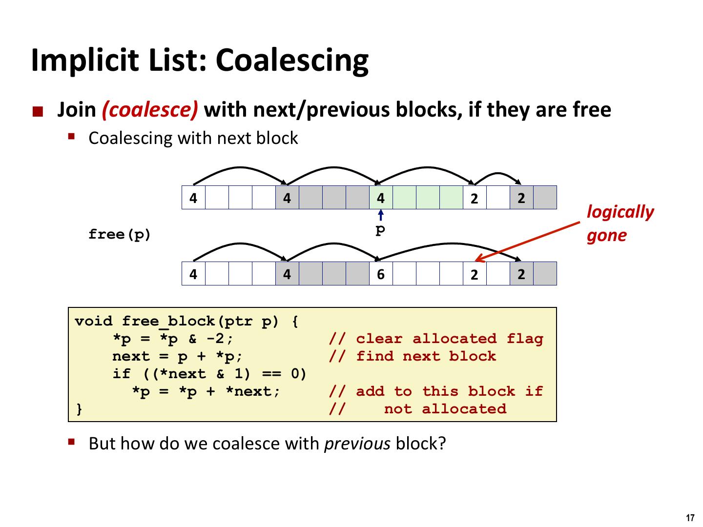 17 . Binghamton University Implicit List: Coalescing ¢ Join (coalesce) with next/previous blocks, if they are free § Coalescing with next block 4 4 4 2 2 logically p free(p) gone 4 4 6 2 2 void free_block(ptr p) { *p = *p & -2; // clear allocated flag next = p + *p; // find next block if ((*next & 1) == 0) *p = *p + *next; // add to this block if } // not allocated § But how do we coalesce with previous block? 17