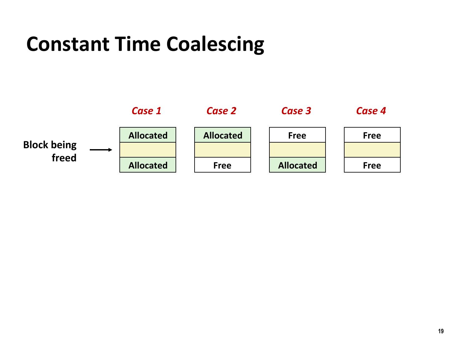 19 . Binghamton University Constant Time Coalescing Case 1 Case 2 Case 3 Case 4 Allocated Allocated Free Free Block being freed Allocated Free Allocated Free 19