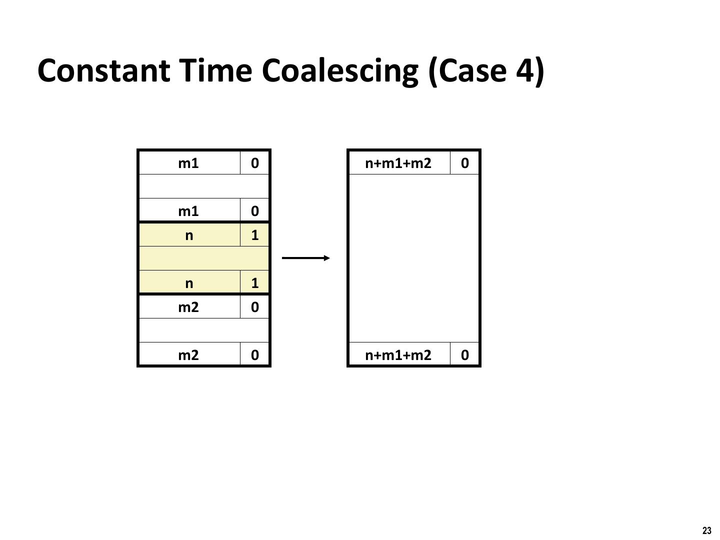 22 . Binghamton University Constant Time Coalescing (Case 3) m1 0 n+m1 0 m1 0 n 1 n 1 n+m1 0 m2 1 m2 1 m2 1 m2 1 22