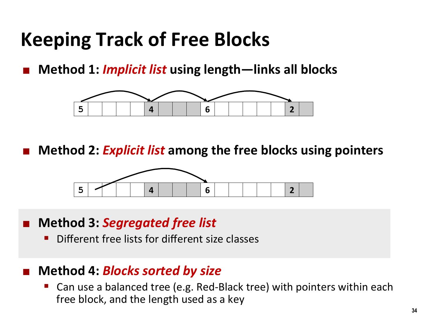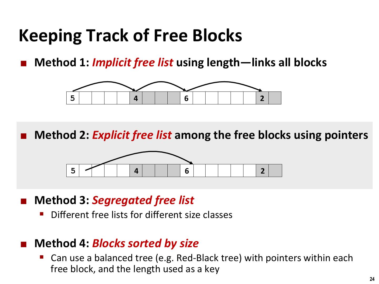 24 . Binghamton University Keeping Track of Free Blocks ¢ Method 1: Implicit free list using length—links all blocks 5 4 6 2 ¢ Method 2: Explicit free list among the free blocks using pointers 5 4 6 2 ¢ Method 3: Segregated free list § Different free lists for different size classes ¢ Method 4: Blocks sorted by size § Can use a balanced tree (e.g. Red-Black tree) with pointers within each free block, and the length used as a key 24