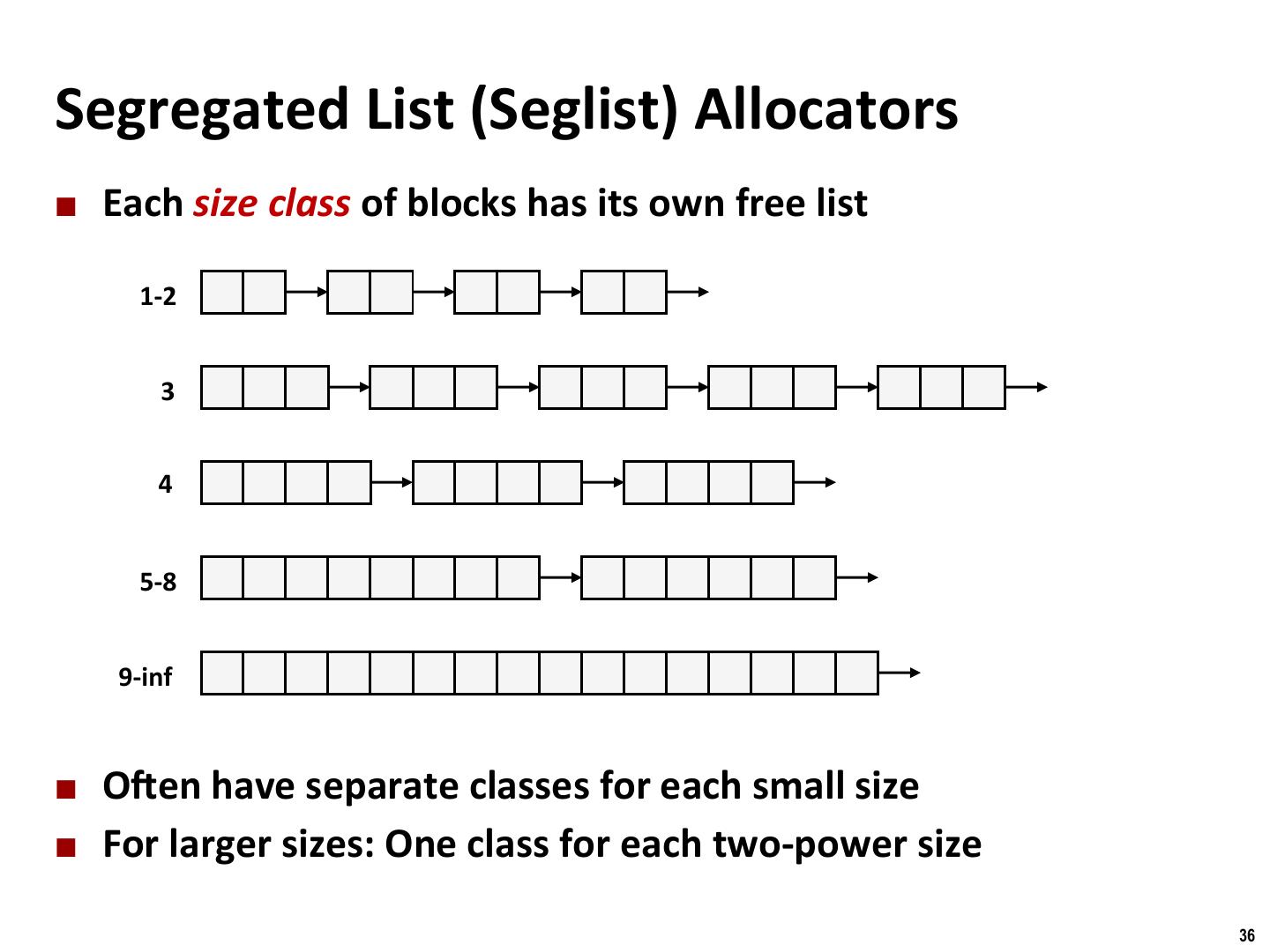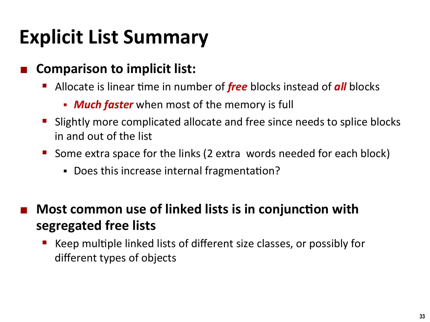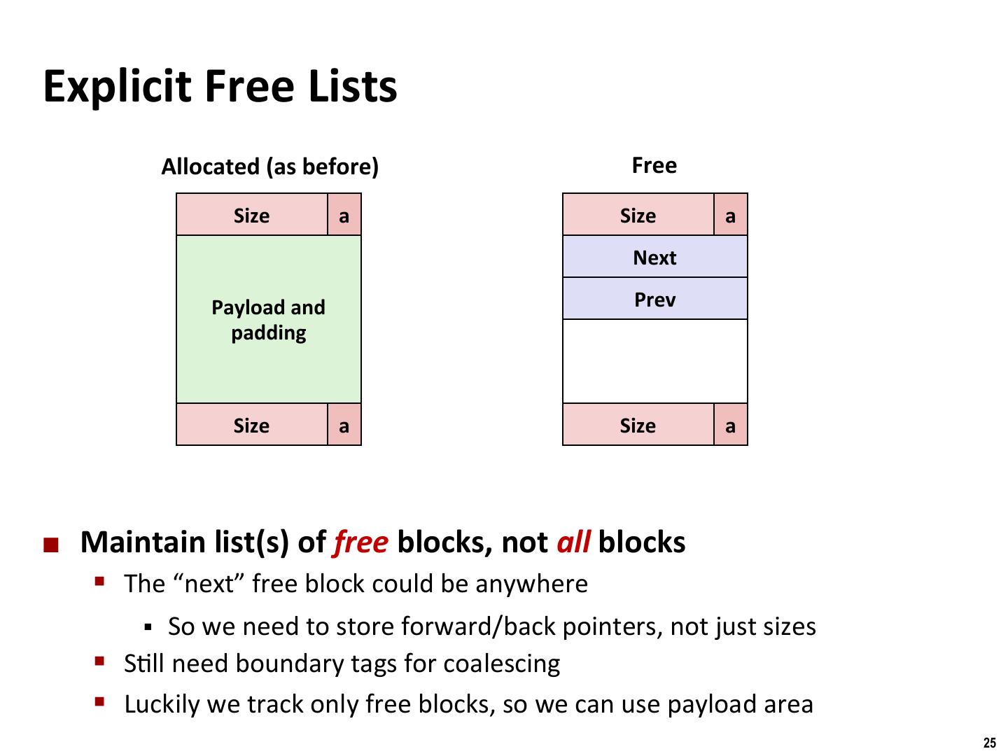 25 . Binghamton University Explicit Free Lists Allocated (as before) Free Size a Size a Next Payload and Prev padding Size a Size a ¢ Maintain list(s) of free blocks, not all blocks § The “next” free block could be anywhere § So we need to store forward/back pointers, not just sizes § S/ll need boundary tags for coalescing § Luckily we track only free blocks, so we can use payload area 25