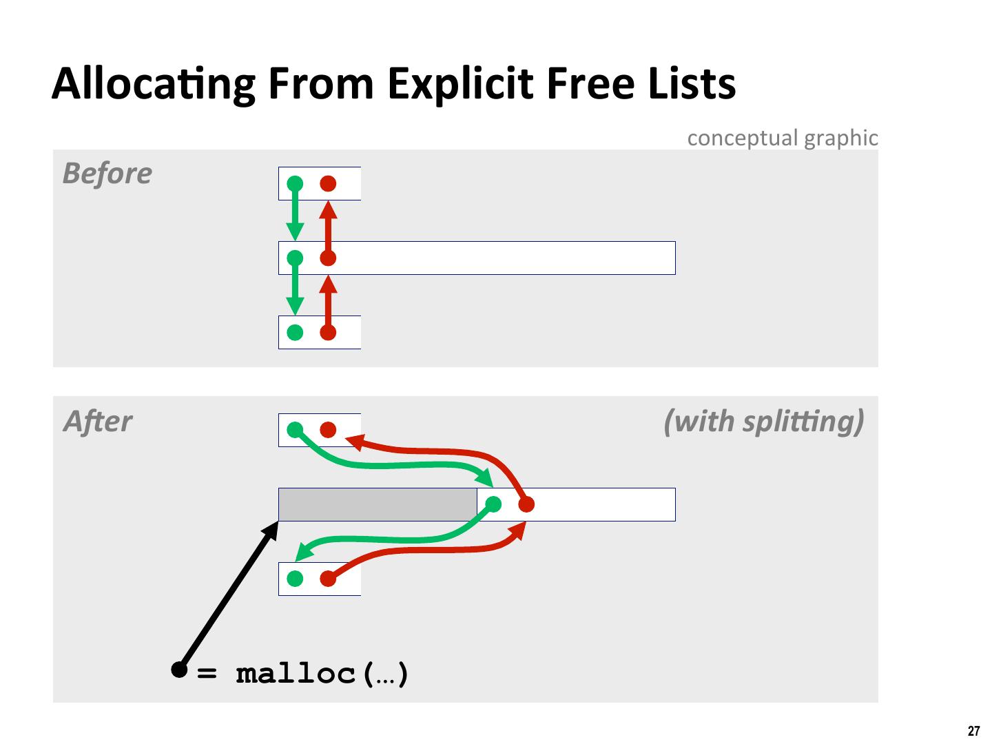 27 . Binghamton University Alloca/ng From Explicit Free Lists conceptual graphic Before AKer (with spli?ng) = malloc(…) 27