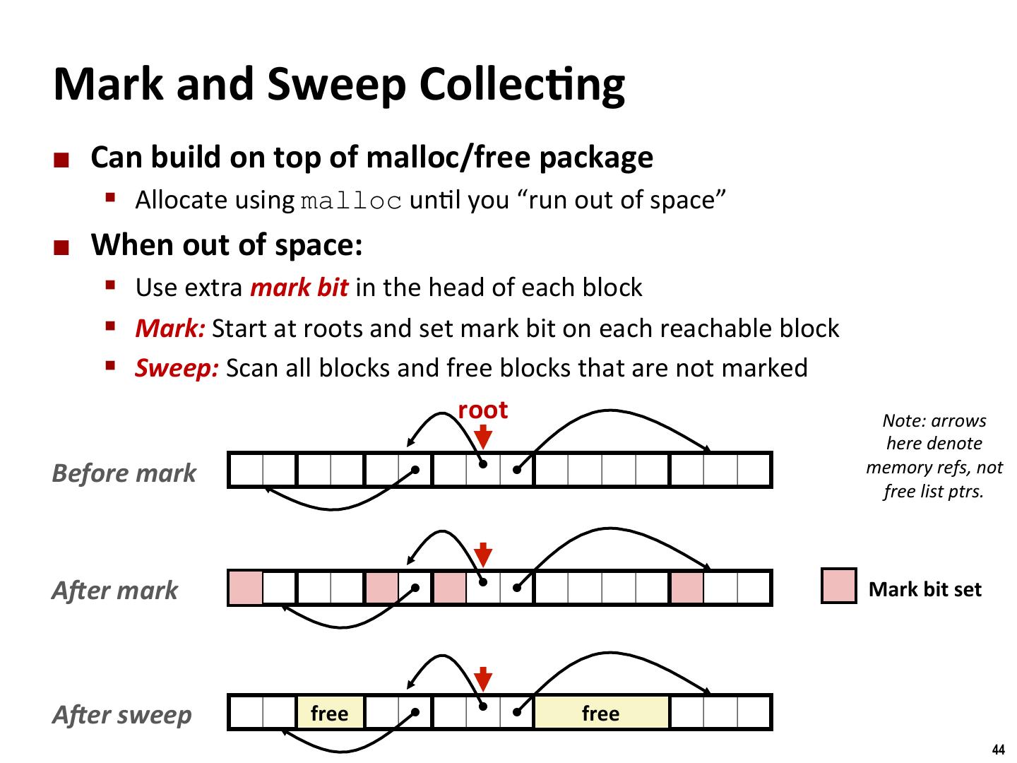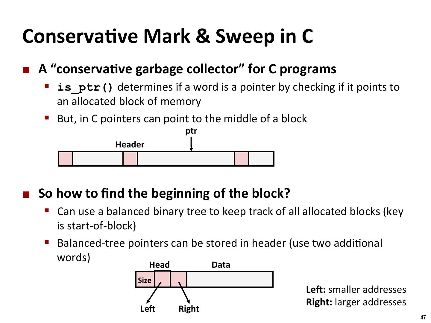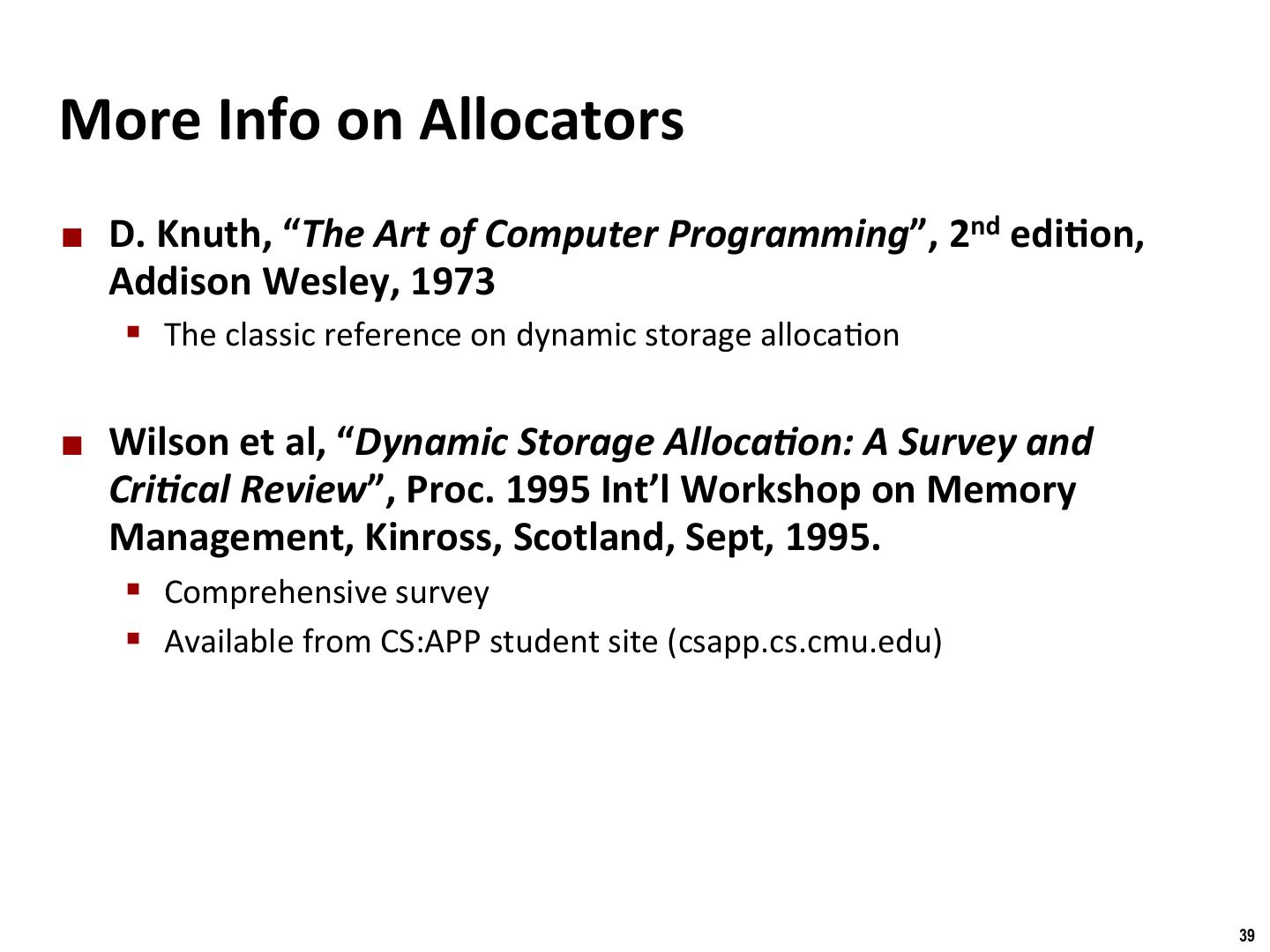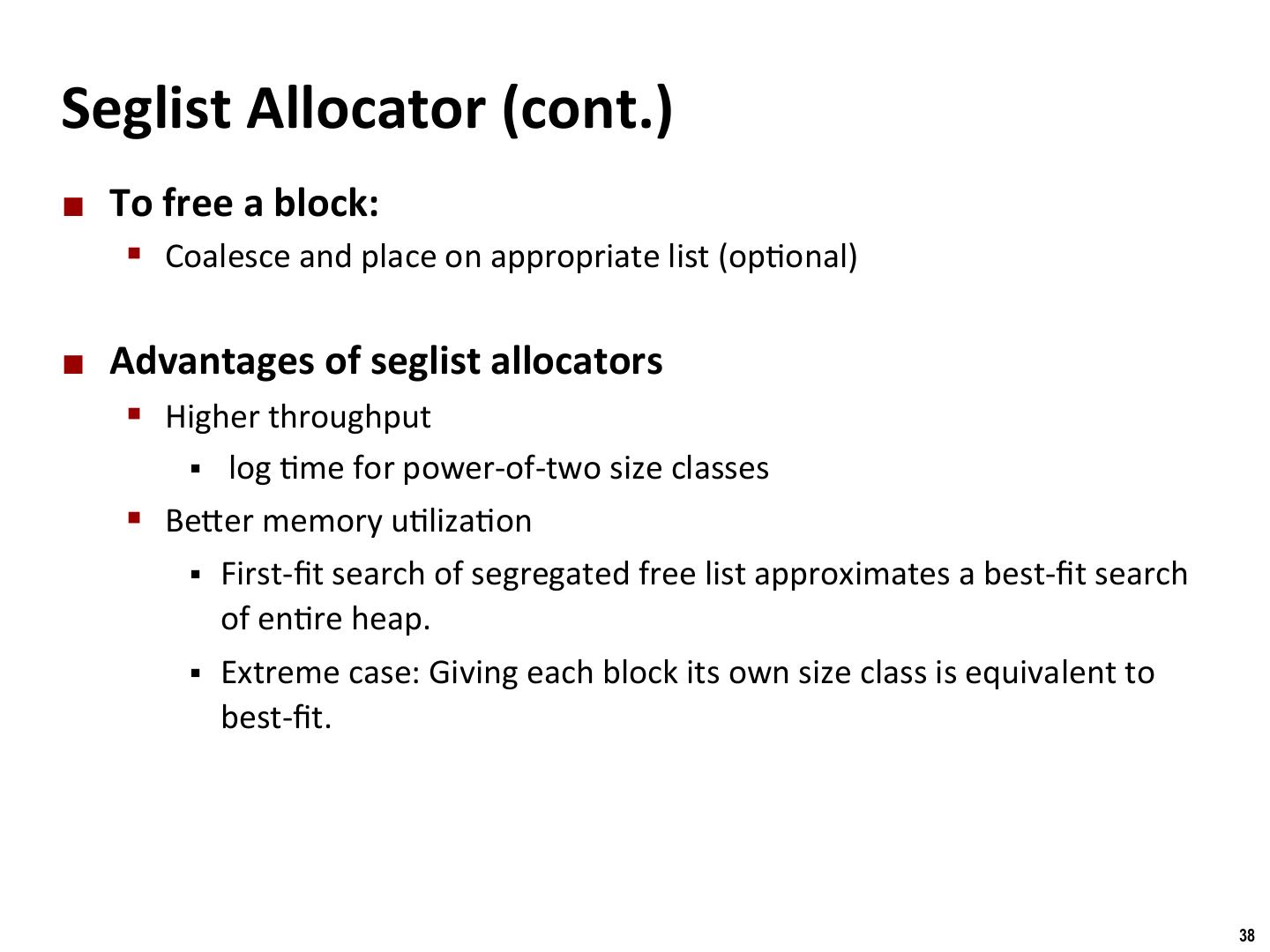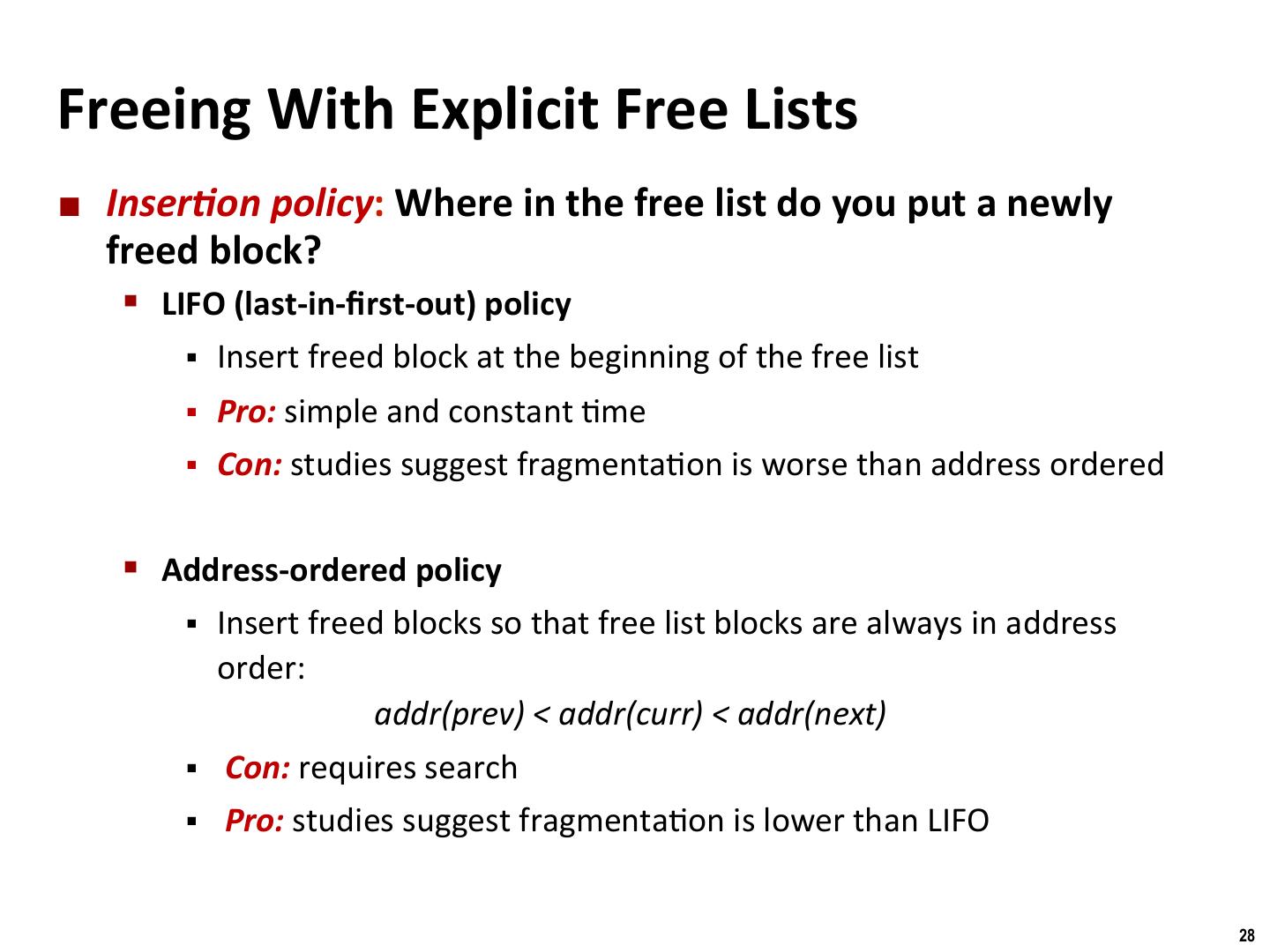 28 . Binghamton University Freeing With Explicit Free Lists ¢ InserMon policy: Where in the free list do you put a newly freed block? § LIFO (last-in-first-out) policy § Insert freed block at the beginning of the free list § Pro: simple and constant /me § Con: studies suggest fragmenta/on is worse than address ordered § Address-ordered policy § Insert freed blocks so that free list blocks are always in address order: addr(prev) < addr(curr) < addr(next) § Con: requires search § Pro: studies suggest fragmenta/on is lower than LIFO 28