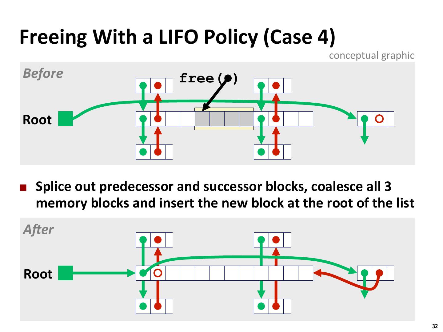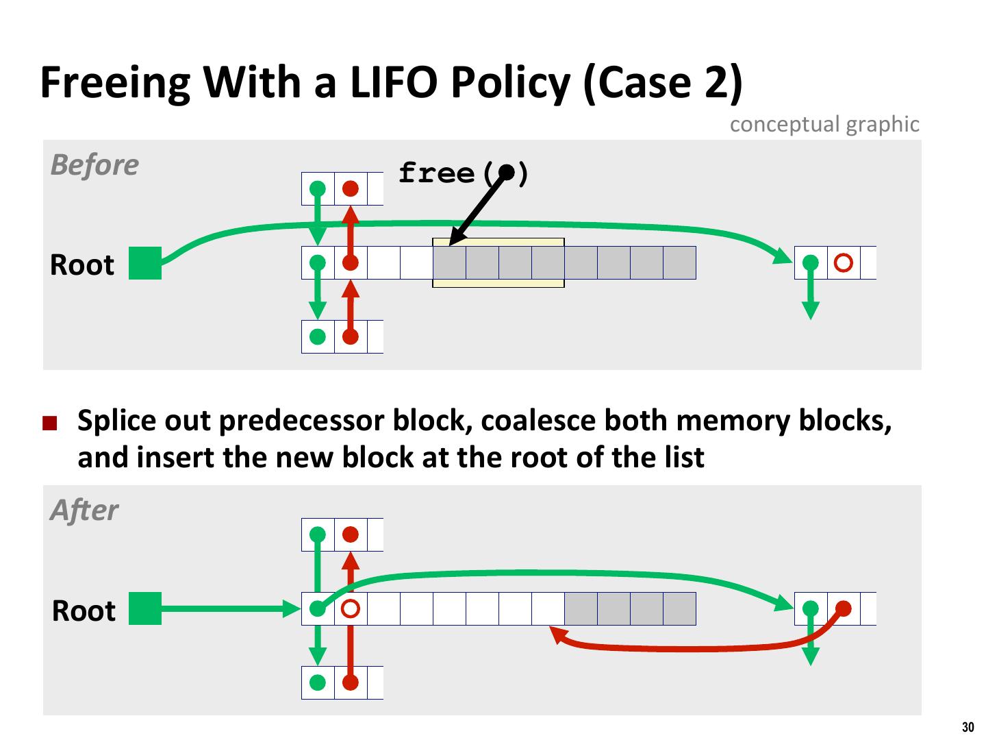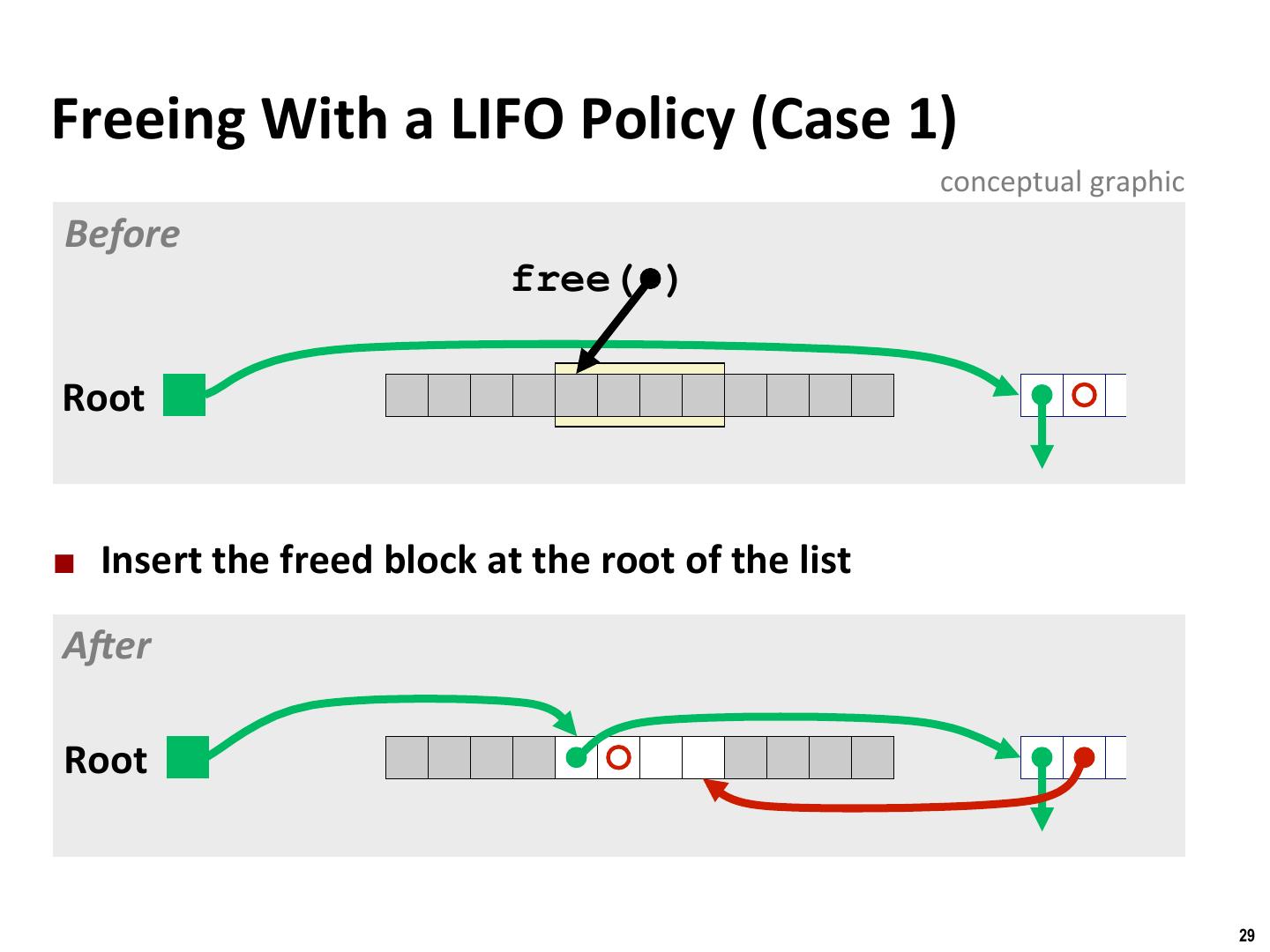 29 . Binghamton University Freeing With a LIFO Policy (Case 1) conceptual graphic Before free( ) Root ¢ Insert the freed block at the root of the list AKer Root 29