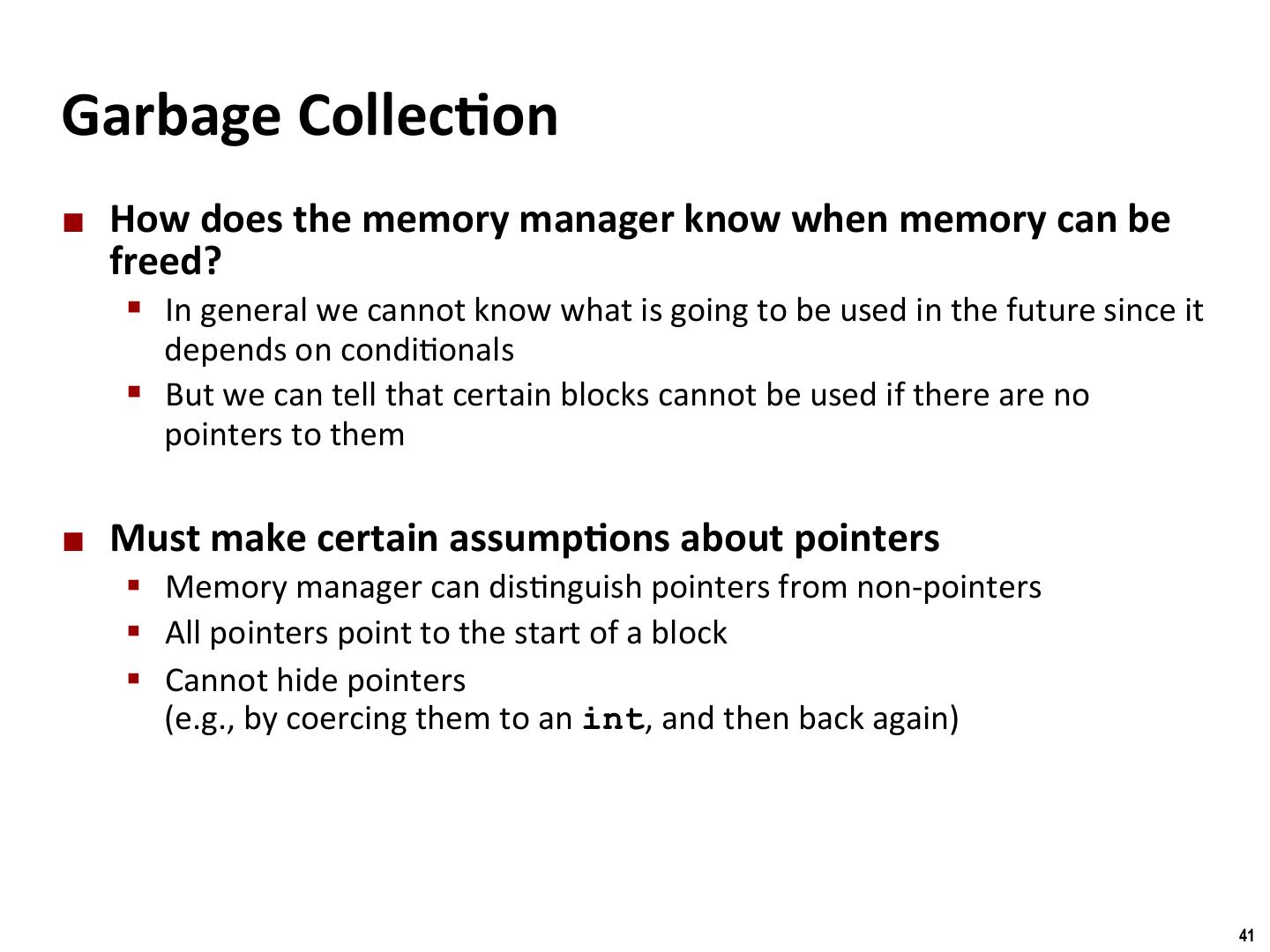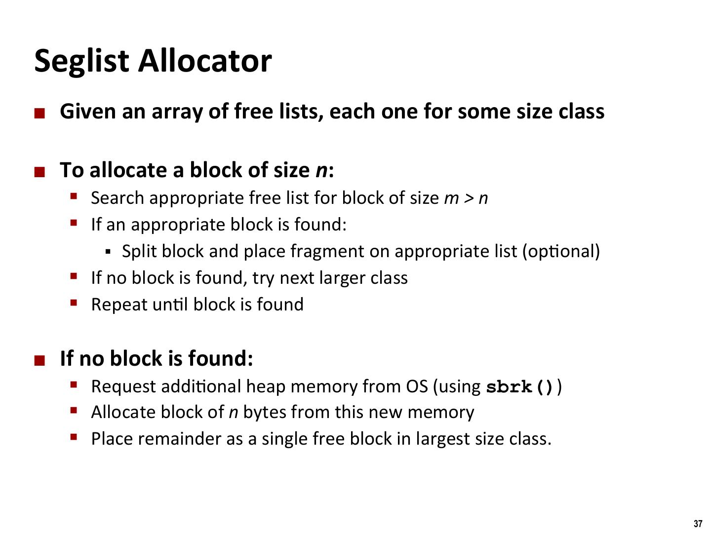 26 . Binghamton University Explicit Free Lists ¢ Logically: A B C ¢ Physically: blocks can be in any order Forward (next) links A B 4 4 4 4 6 6 4 4 4 4 C Back (prev) links 26