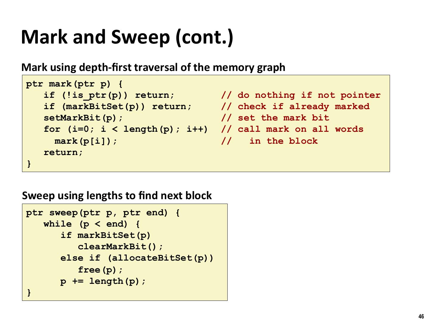 14 . Binghamton University Implicit List: Finding a Free Block ¢ First fit: § Search list from beginning, choose first free block that fits: p = start; while ((p < end) && \\ not passed end ((*p & 1) || \\ already allocated (*p <= len))) \\ too small p = p + (*p & -2); \\ goto next block (word addressed) § Can take linear /me in total number of blocks (allocated and free) § In prac/ce it can cause “splinters” at beginning of list ¢ Next fit: § Like first fit, but search list star/ng where previous search finished § Should o\en be faster than first fit: avoids re-scanning unhelpful blocks § Some research suggests that fragmenta/on is worse ¢ Best fit: § Search the list, choose the best free block: fits, with fewest bytes le\ over § Keeps fragments small—usually helps fragmenta/on § Will typically run slower than first fit 14