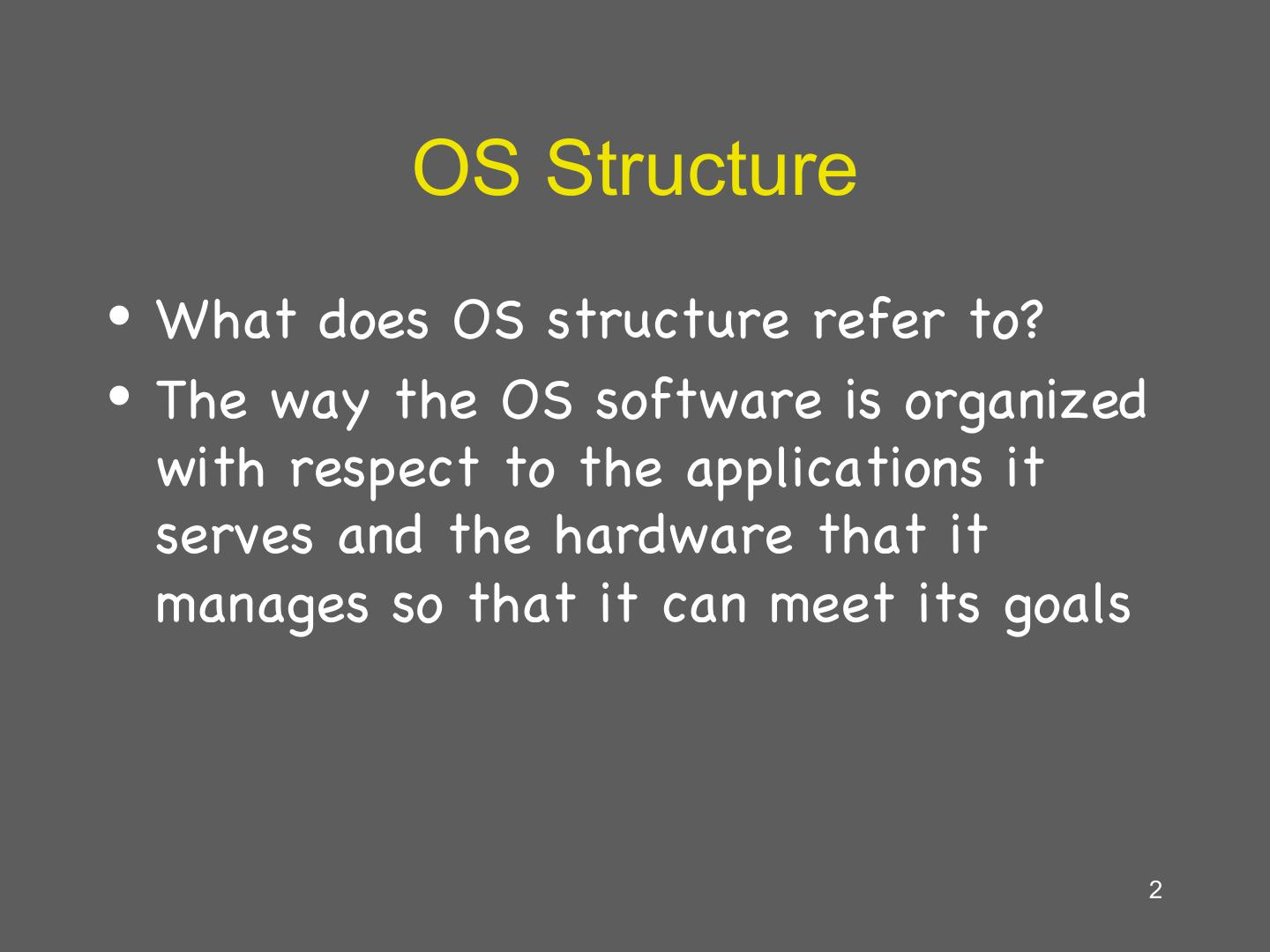 2 . OS Structure • What does OS structure refer to? • The way the OS software is organized with respect to the applications it serves and the hardware that it manages so that it can meet its goals 2