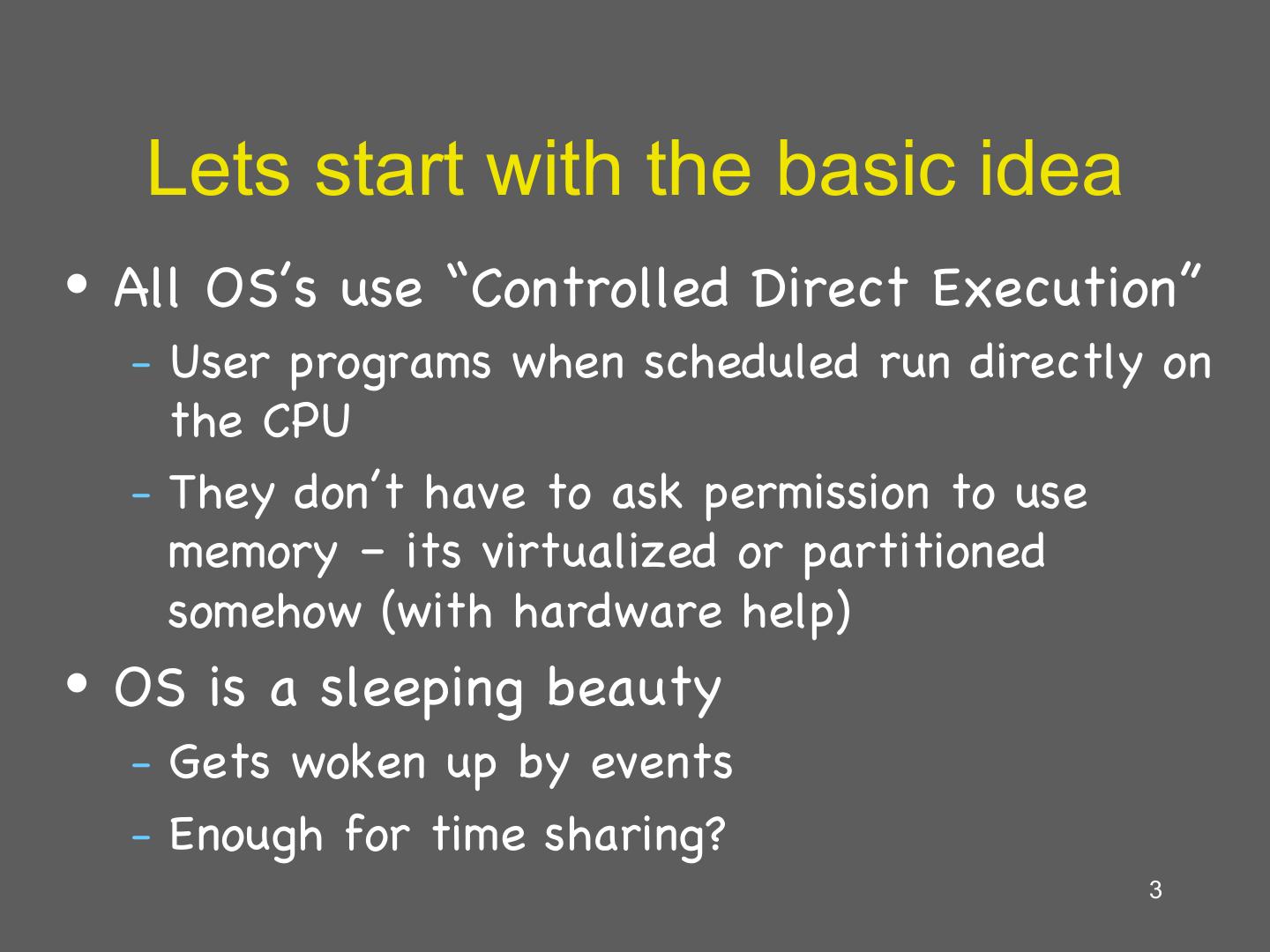 3 . Lets start with the basic idea • All OS’s use “Controlled Direct Execution” – User programs when scheduled run directly on the CPU – They don’t have to ask permission to use memory – its virtualized or partitioned somehow (with hardware help) • OS is a sleeping beauty – Gets woken up by events – Enough for time sharing? 3