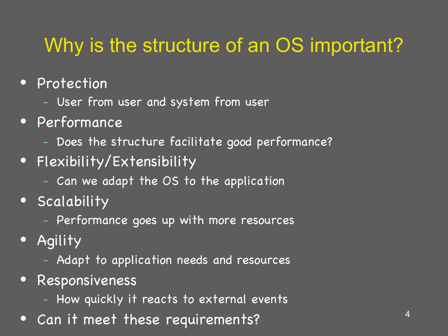 4 . Why is the structure of an OS important? • Protection – User from user and system from user • Performance – Does the structure facilitate good performance? • Flexibility/Extensibility – Can we adapt the OS to the application • Scalability – Performance goes up with more resources • Agility – Adapt to application needs and resources • Responsiveness – How quickly it reacts to external events 4 • Can it meet these requirements?