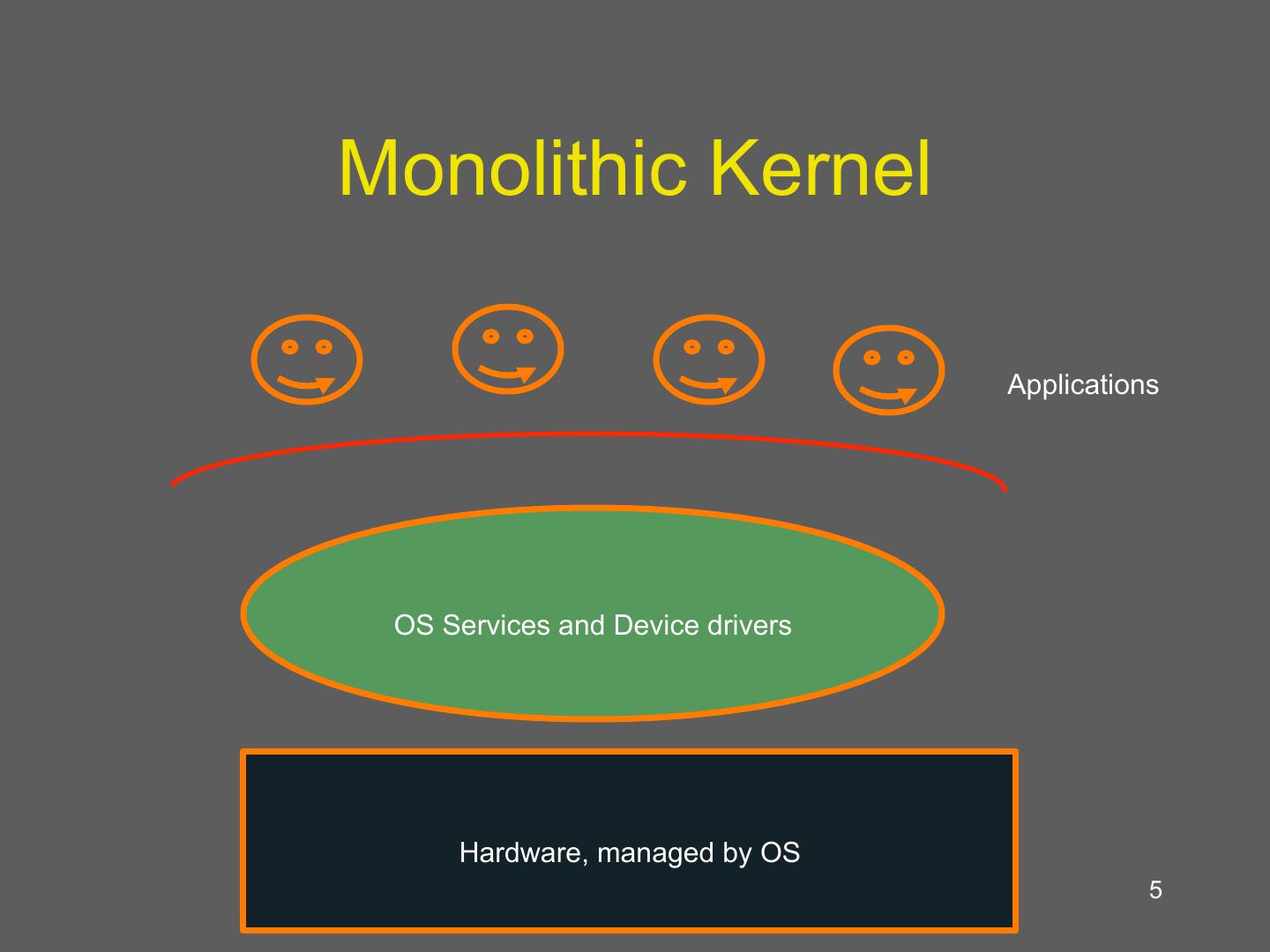 5 .Monolithic Kernel Applications OS Services and Device drivers Hardware, managed by OS 5